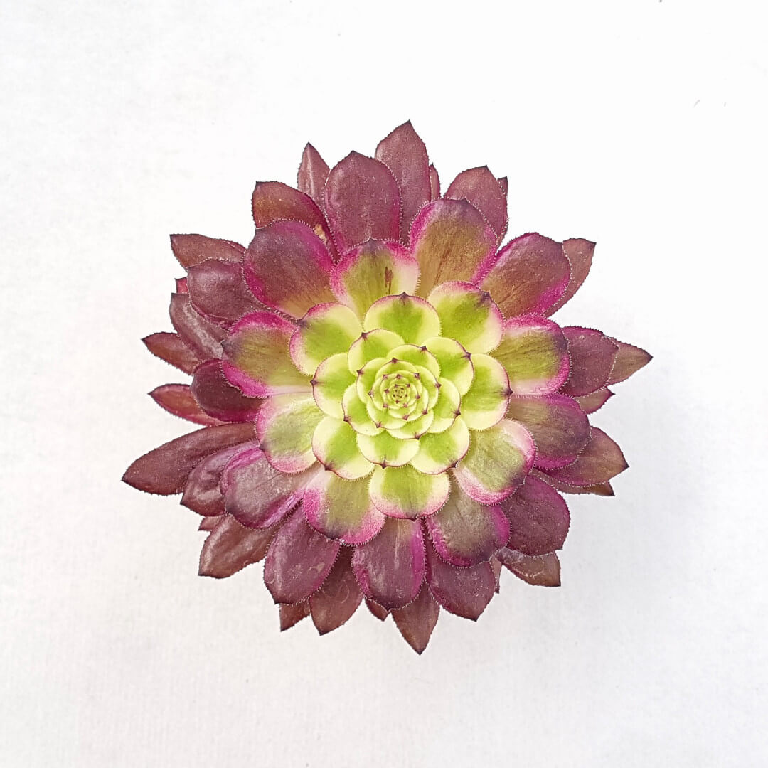 Questo Aeonium dai colori vivaci ha le foglie variegate, in un modo unico! Se coltivate in pieno sole o a temperature più fresche, le foglie per natura colorate a strisce gialle e verdi diventano rosa brillante e verde lime.