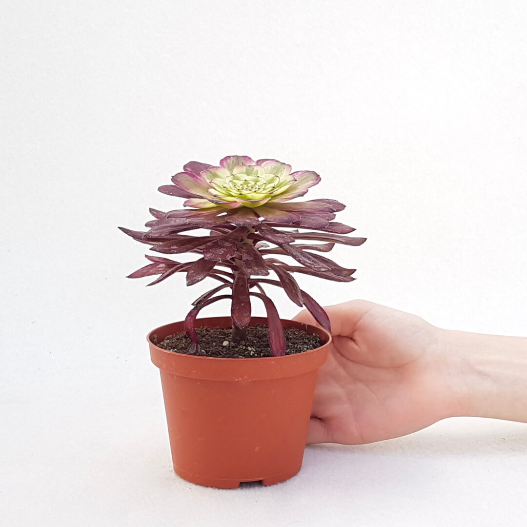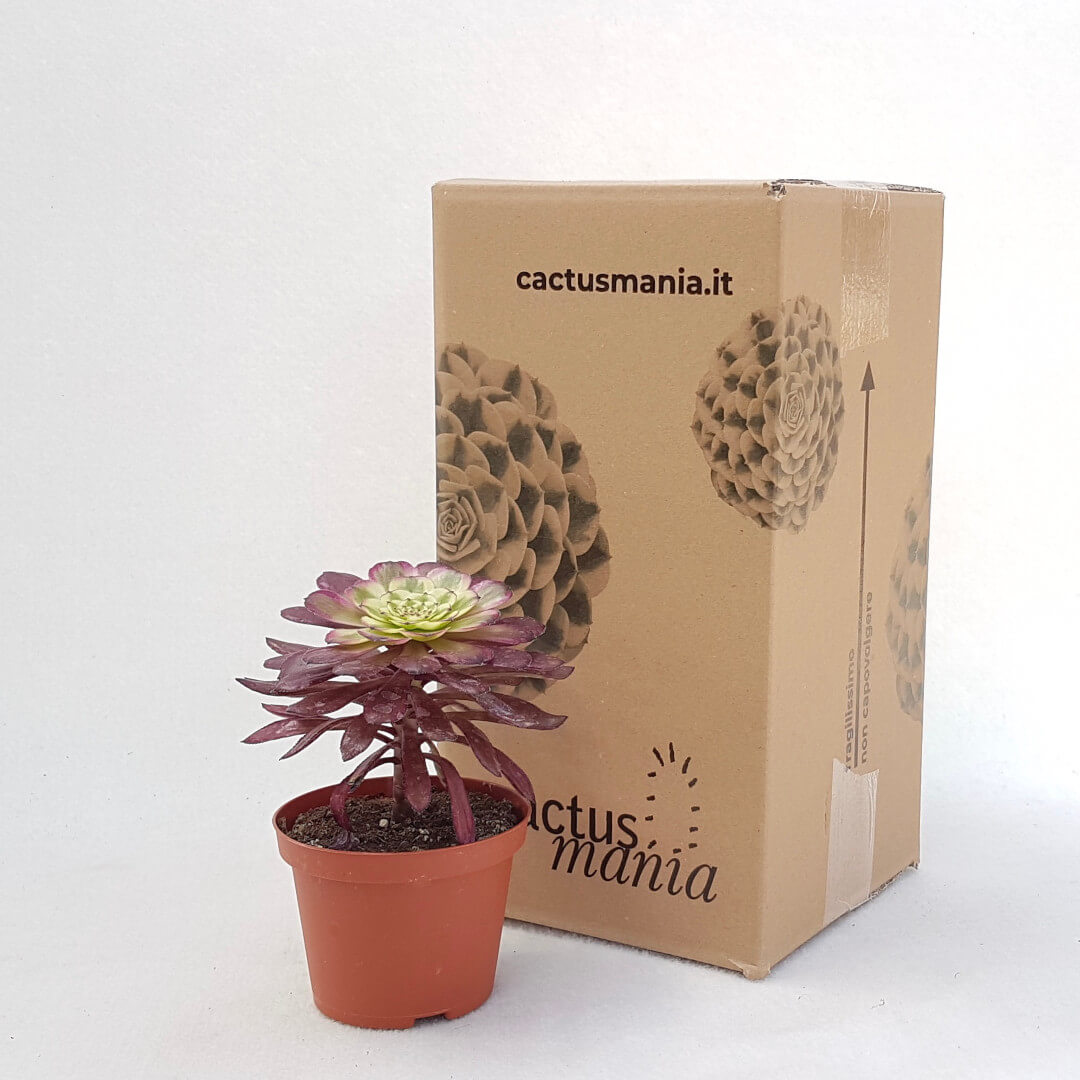 Appartenente alla famiglia delle Crassulaceae, questa pianta di Aeonium arboreum hyb. ‘Mardi Gras’ viene fornita in vaso Ø 10,5 cm con etichetta recante il nome botanico.