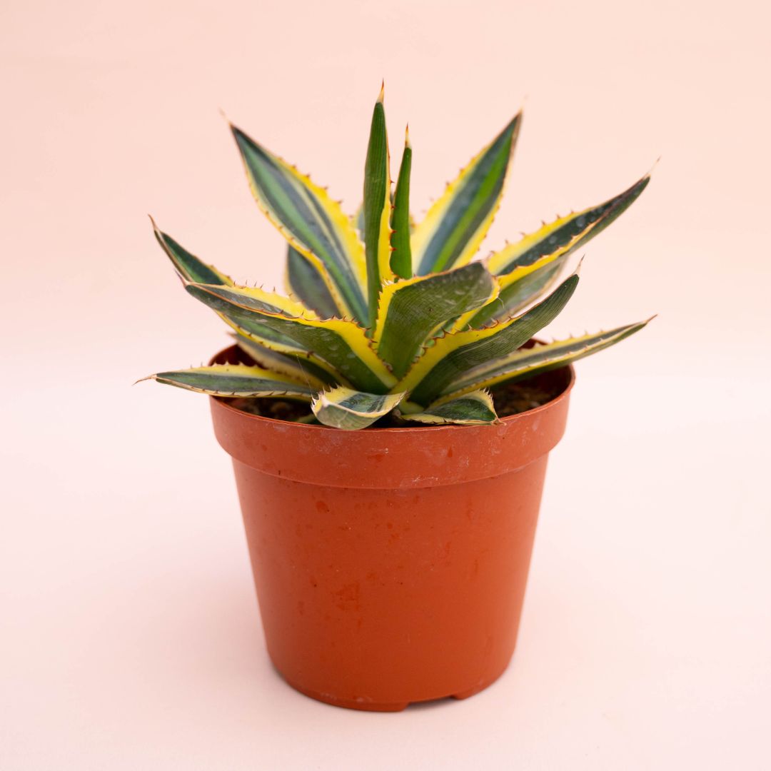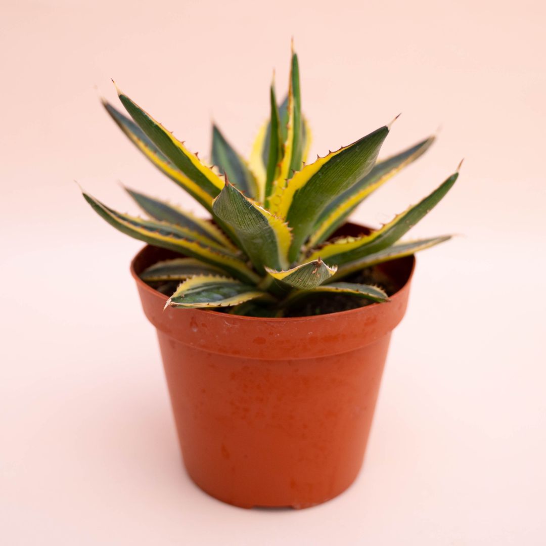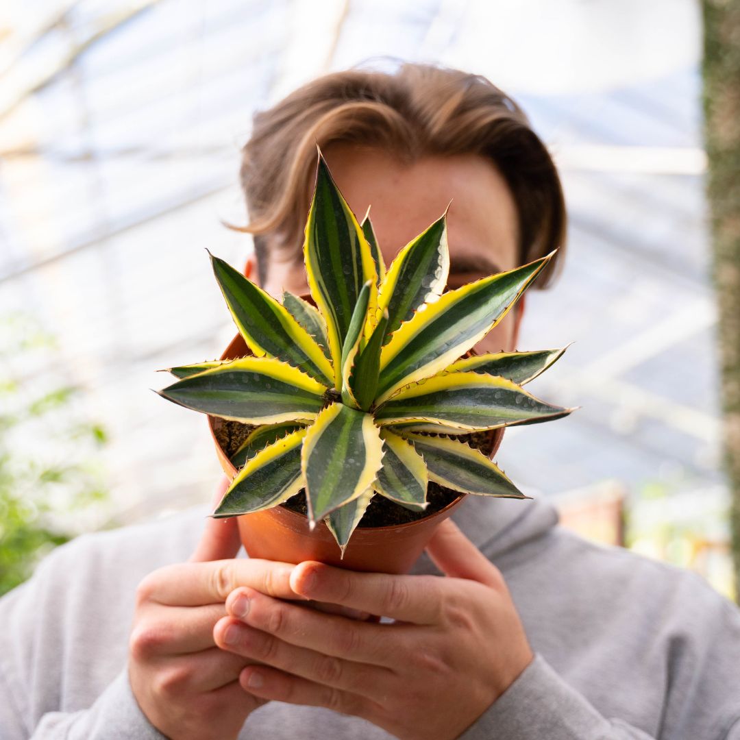 Appartenant à la famille des Asparagaceae, cette plante rare de Agave lophantha variegata est fournie dans un pot Ø 18 cm avec une étiquette portant le nom botanique.
