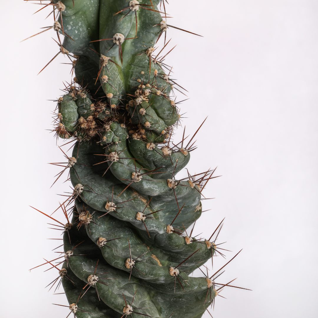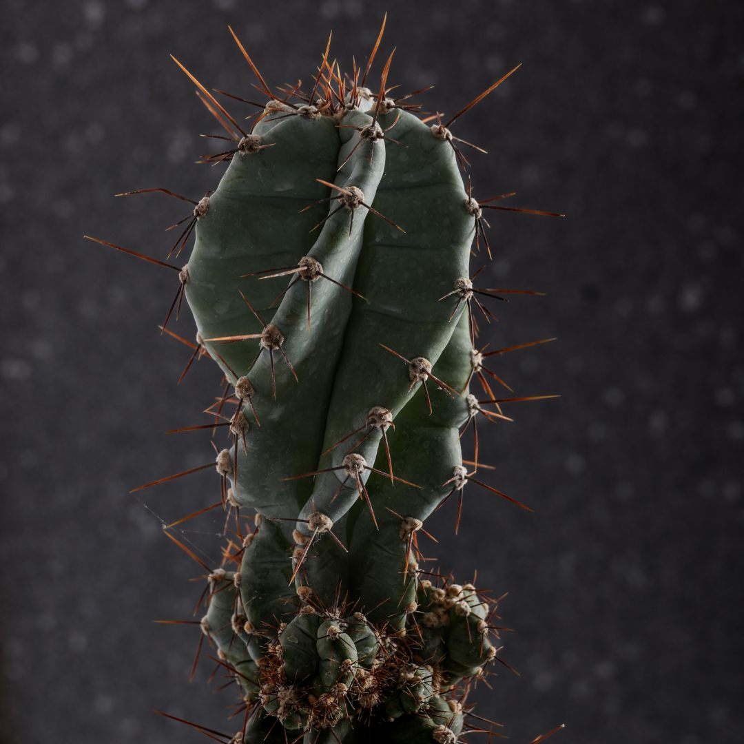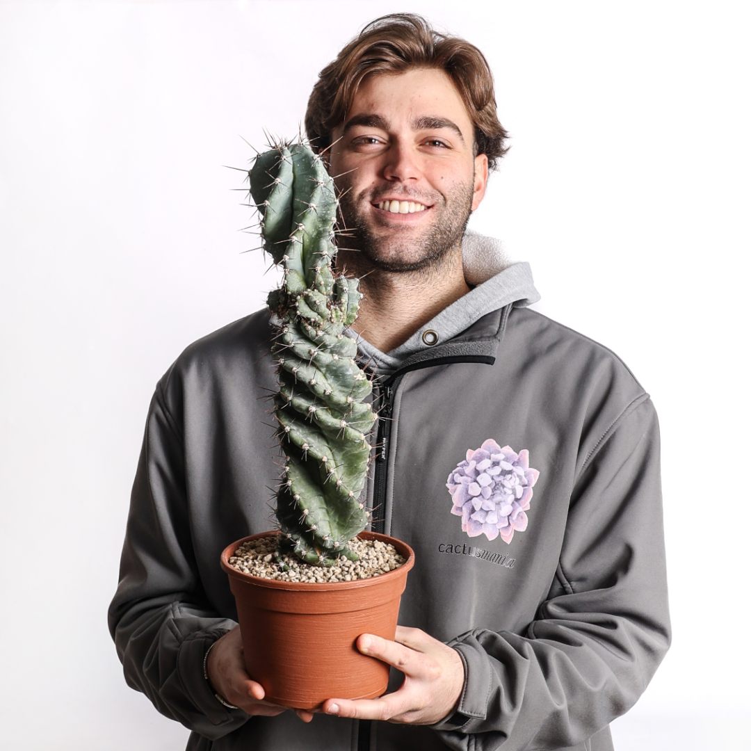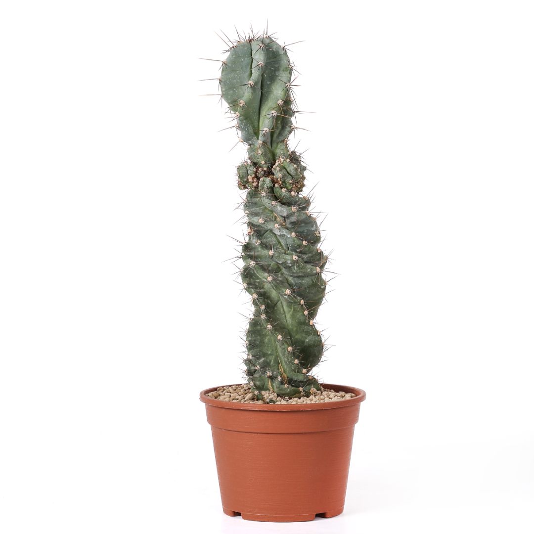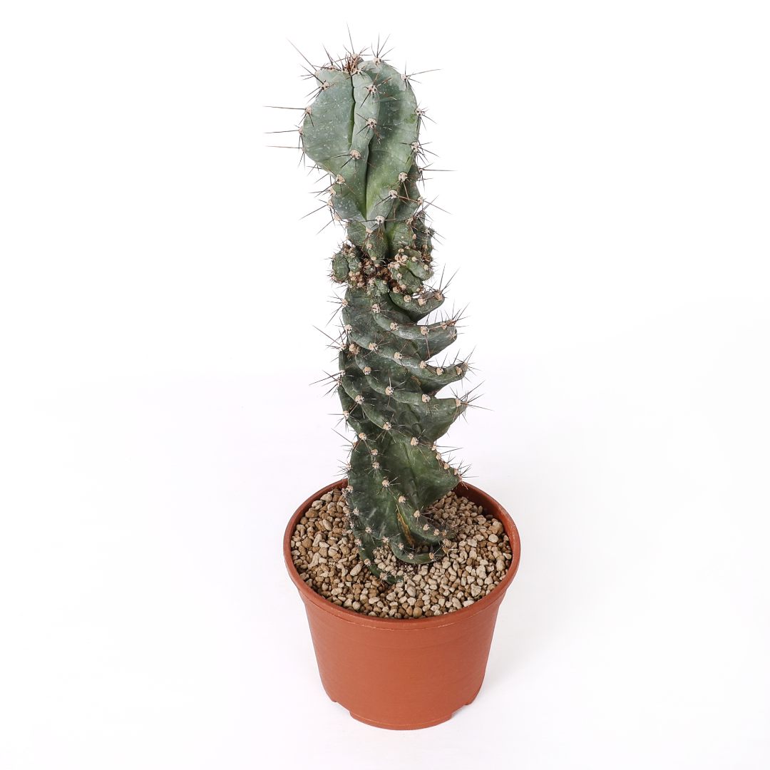 Cereus forbesii spiralis, célèbre pour sa croissance sculpturale qui vrille les côtes de la tige sur elles-mêmes. Plante résistante, sculpturale et ornementale. Nécessite peu d’entretien, aime la lumière et redoute les excès d’eau. Parfaite pour ceux qui recherchent esthétique et forme.