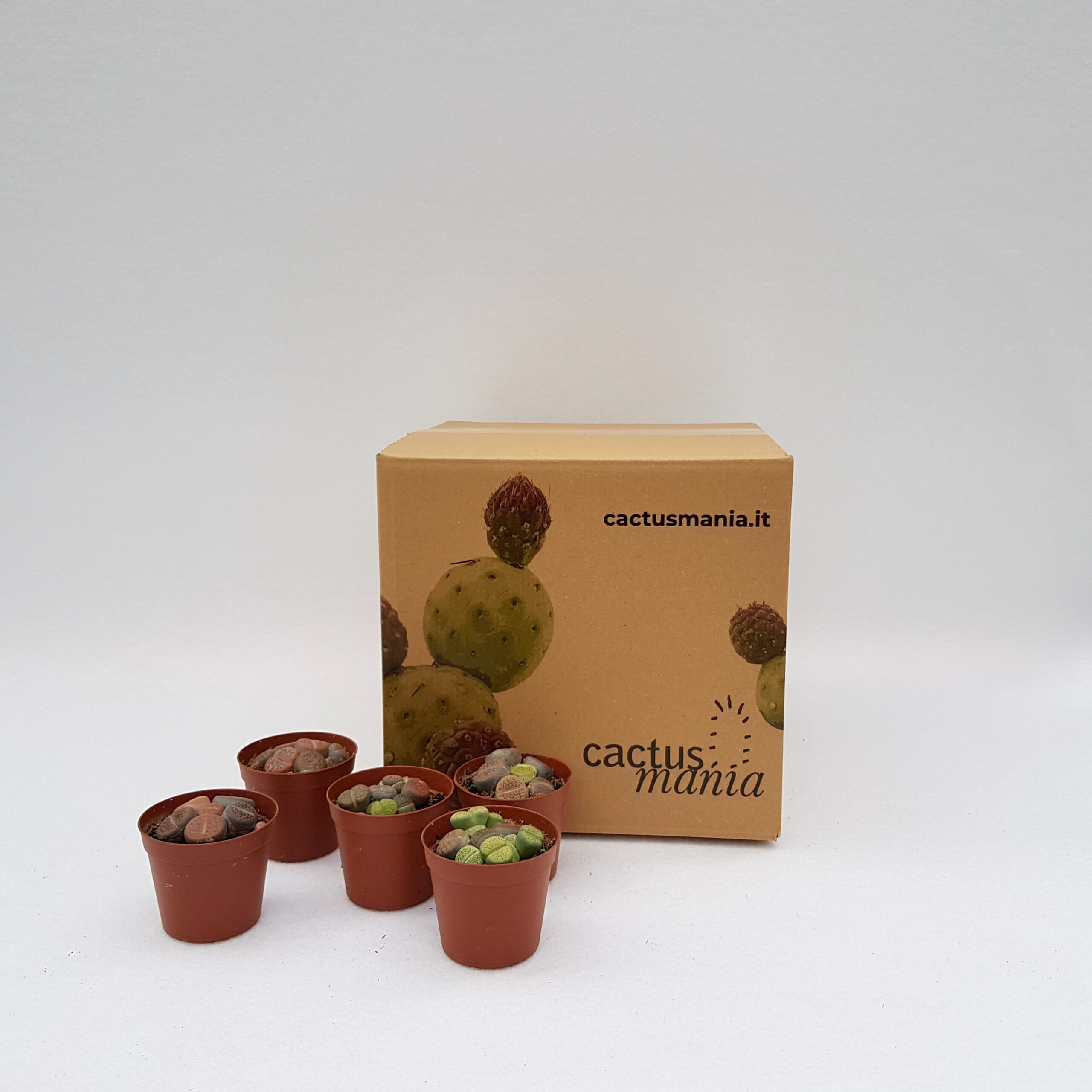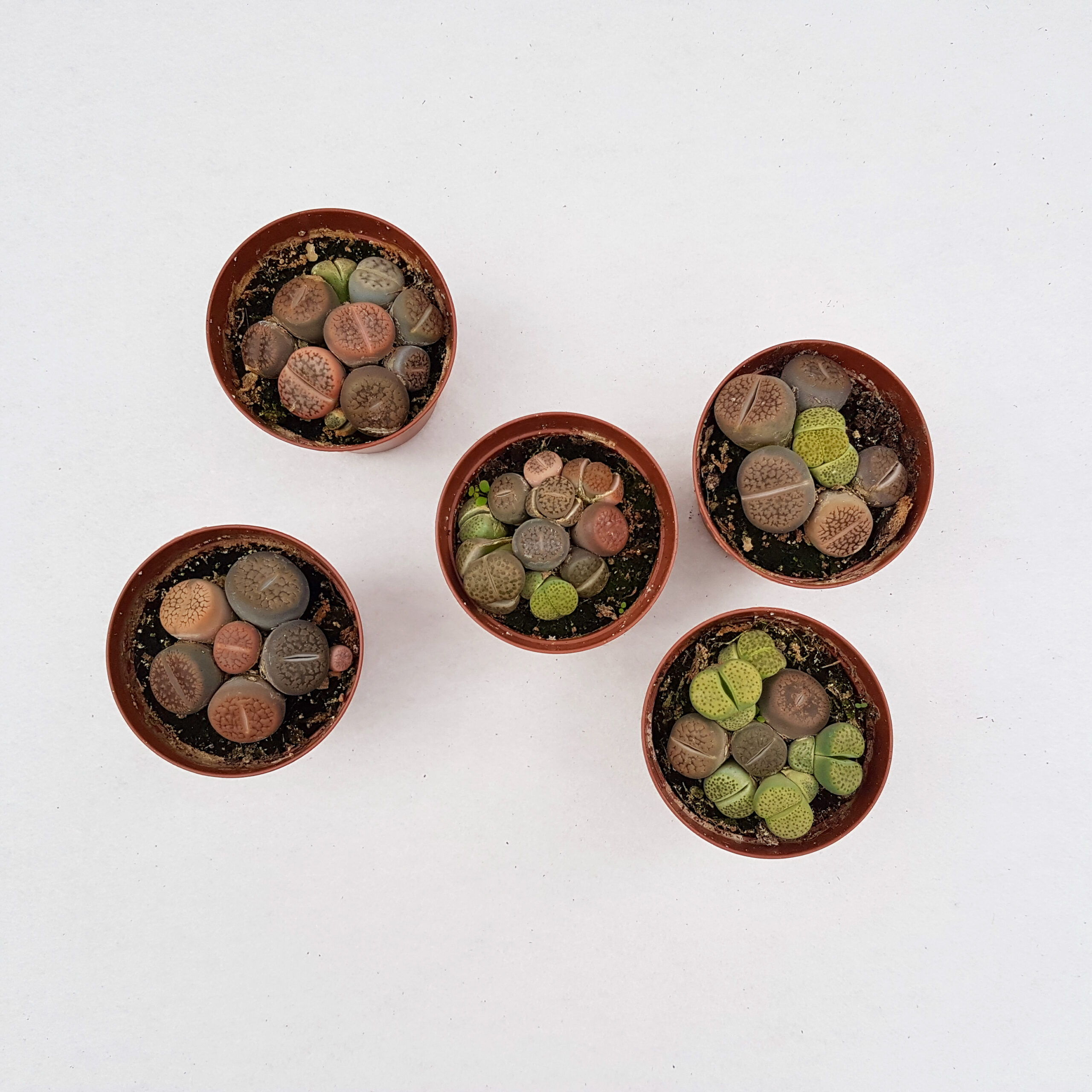 Appartenant à la famille des Aizoaceae, cette collection de 5 Lithops sp. est fournie dans un pot Ø 7,5 avec une étiquette portant le nom botanique.