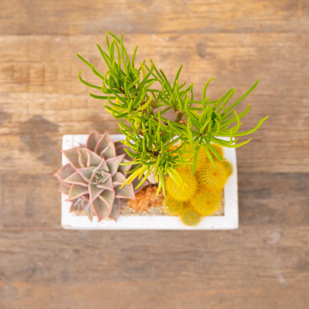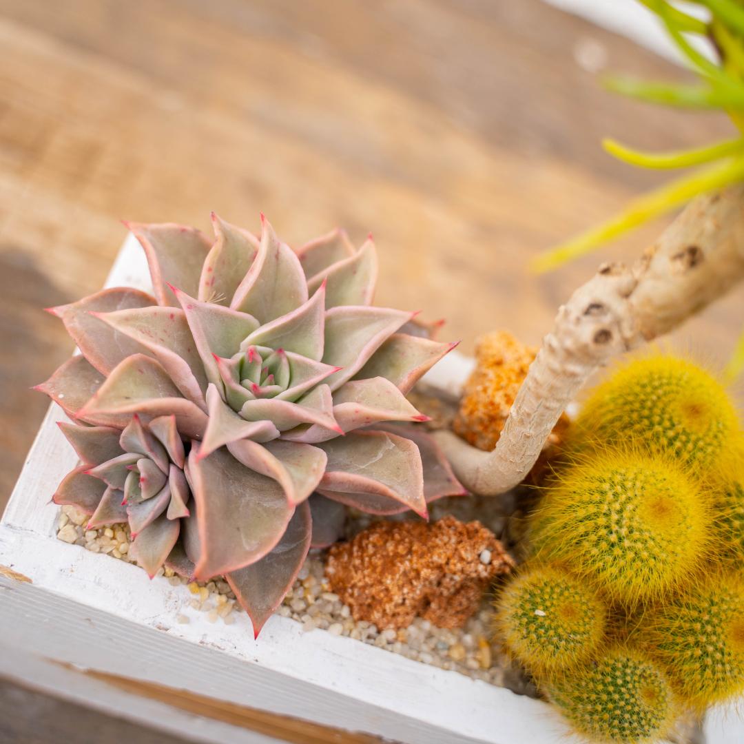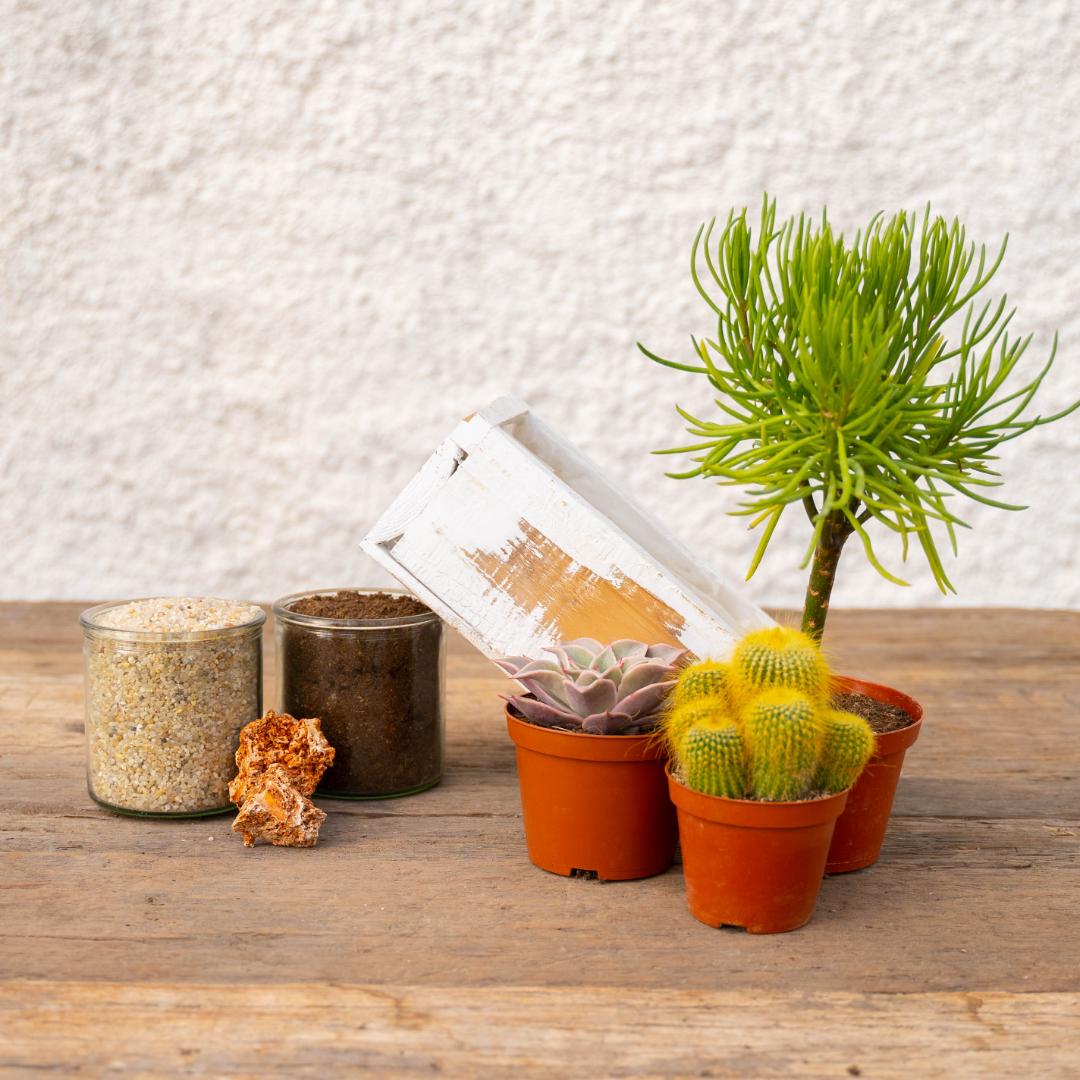 Un terreau spécial pour plantes grasses, des pierres décoratives et du gravier sont inclus dans le kit.