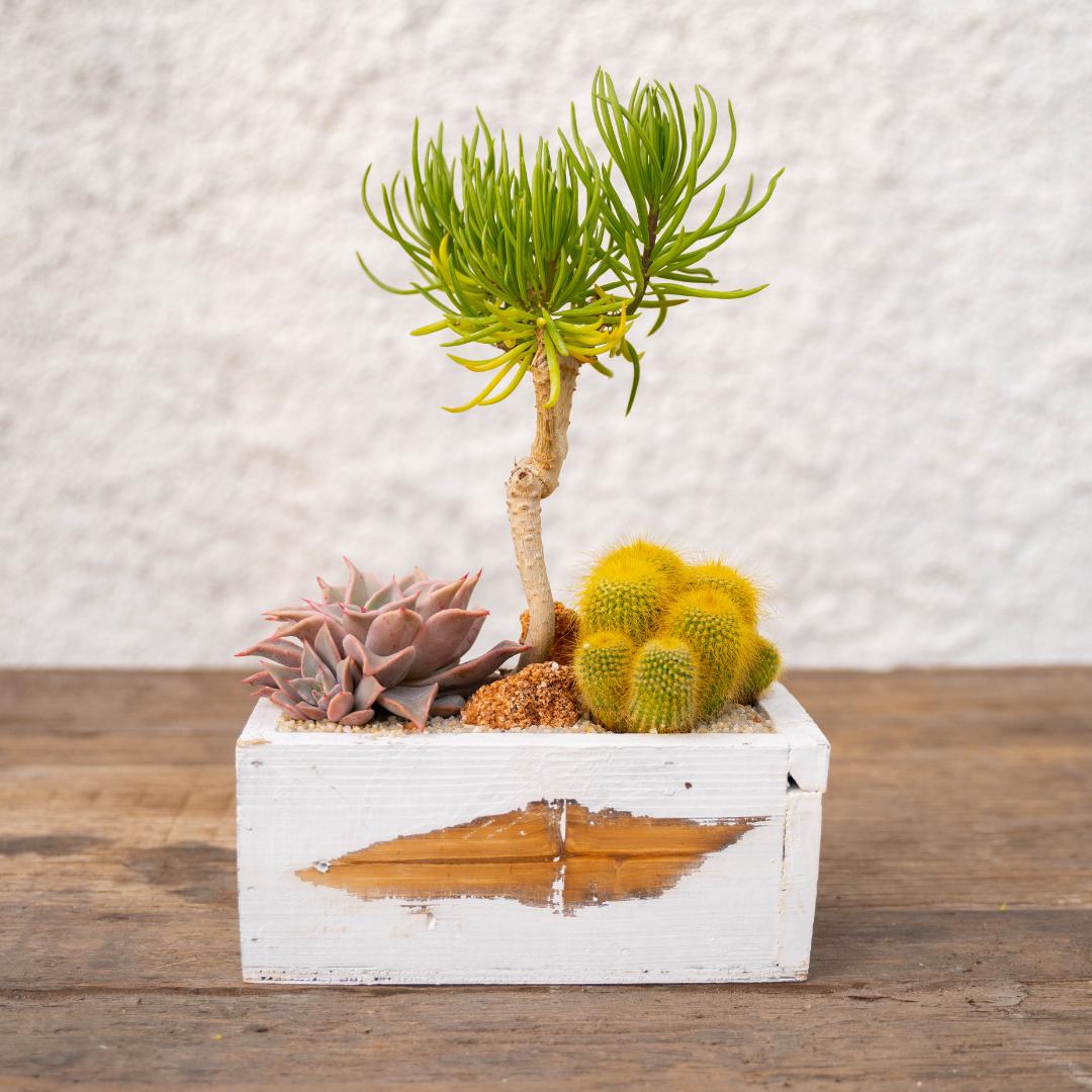 Vous recevrez également un vase en bois (hauteur 10 cm, largeur 12 cm, longueur 20 cm). Le vase n’est pas percé car il est conçu pour votre maison, vos meubles ne seront pas mouillés par cet arrangement. Arrosez vos plantes avec parcimonie et amour.