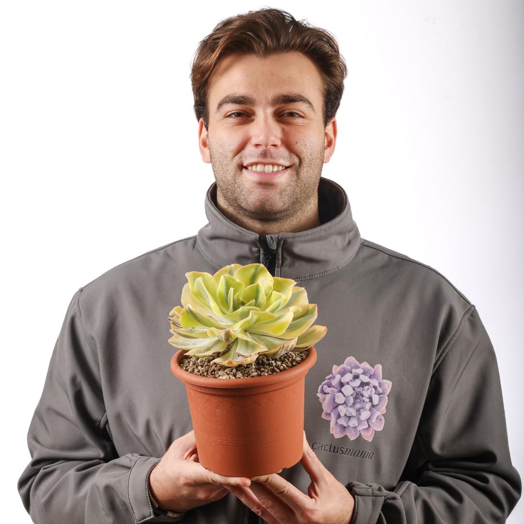 Echeveria ‘Blue Waves’ variegata, une rosette aux tons bleu-vert nuancés de bords ondulés crème, qui lui donnent son nom (waves). Parfaite pour les amateurs de succulentes rares et exclusives. Elle demande peu d’entretien, aime la lumière et craint l’eau stagnante