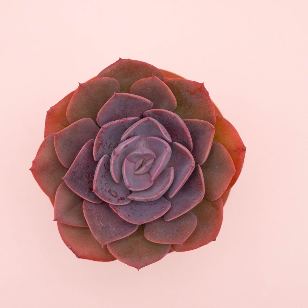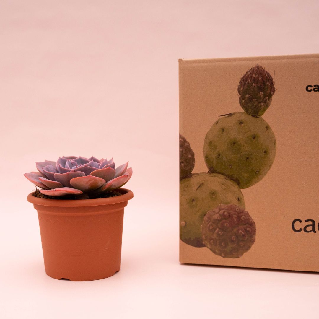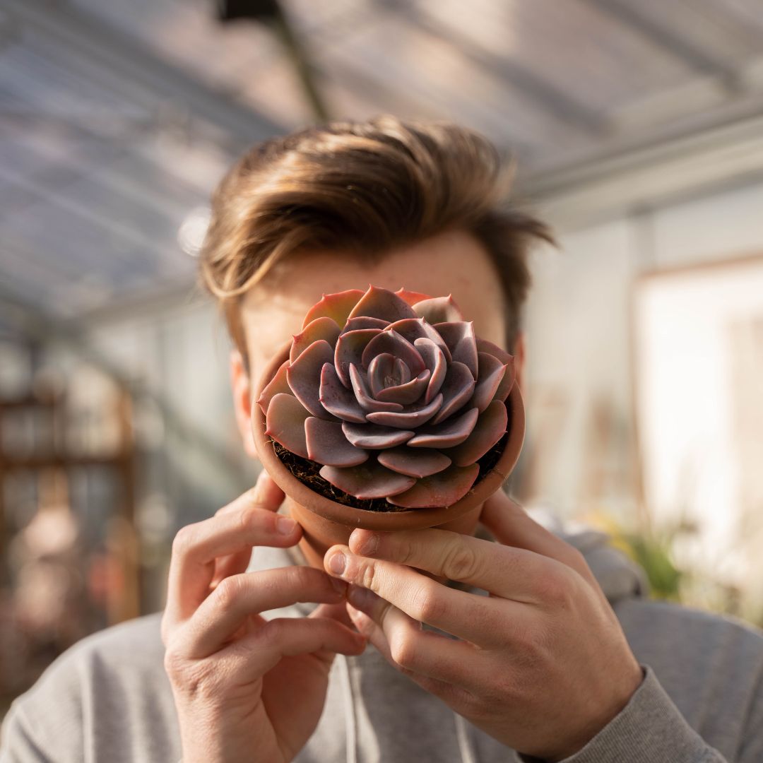 Appartenant à la famille des Crassulaceae, cette plante de Echeveria Dusty Rose est fournie dans un pot Ø 13 avec une étiquette portant le nom botanique.