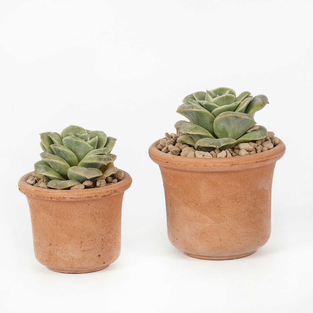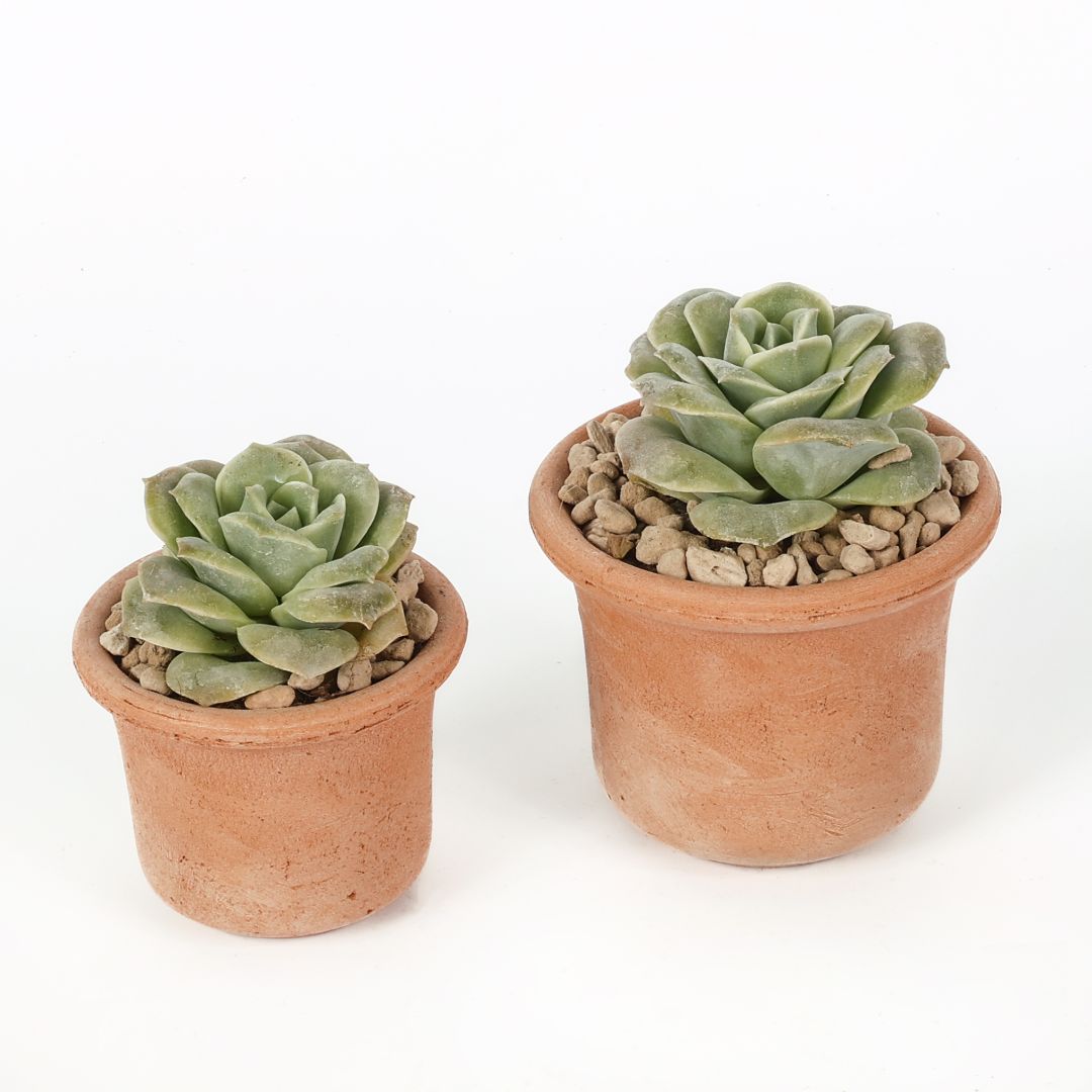 Vous recevrez deux pots en terre cuite de tailles différentes avec deux belles roses echeveria.