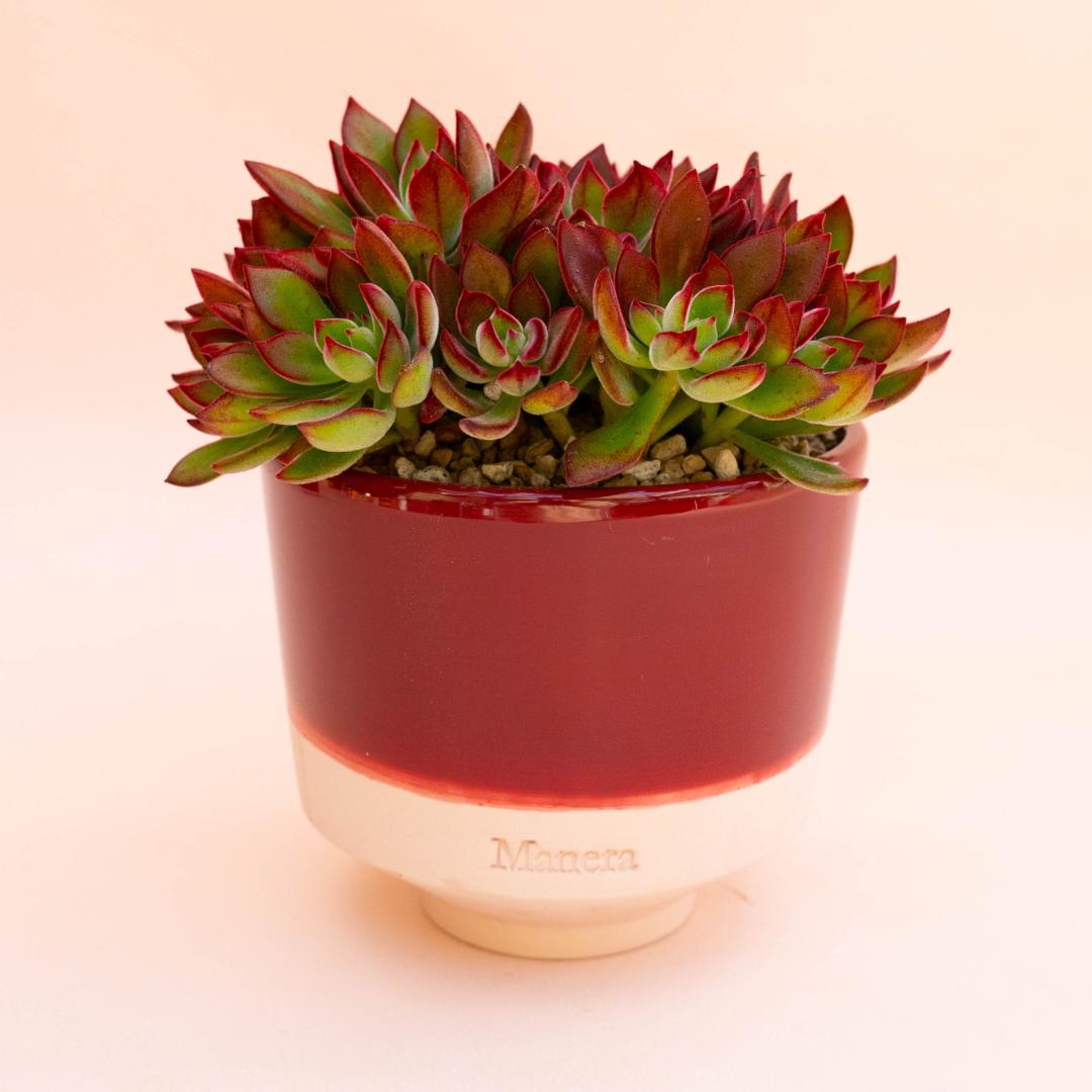 Appartenant à la famille des Crassulaceae, cette plante de Echeveria pulvinata ‘Devotion’ est fournie dans le pot en terre cuite Manera Ø 16 cm avec une étiquette portant le nom botanique.