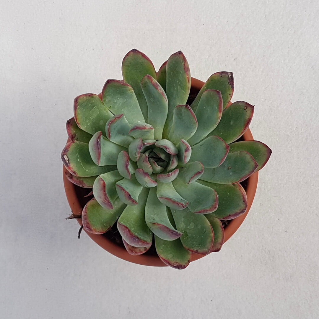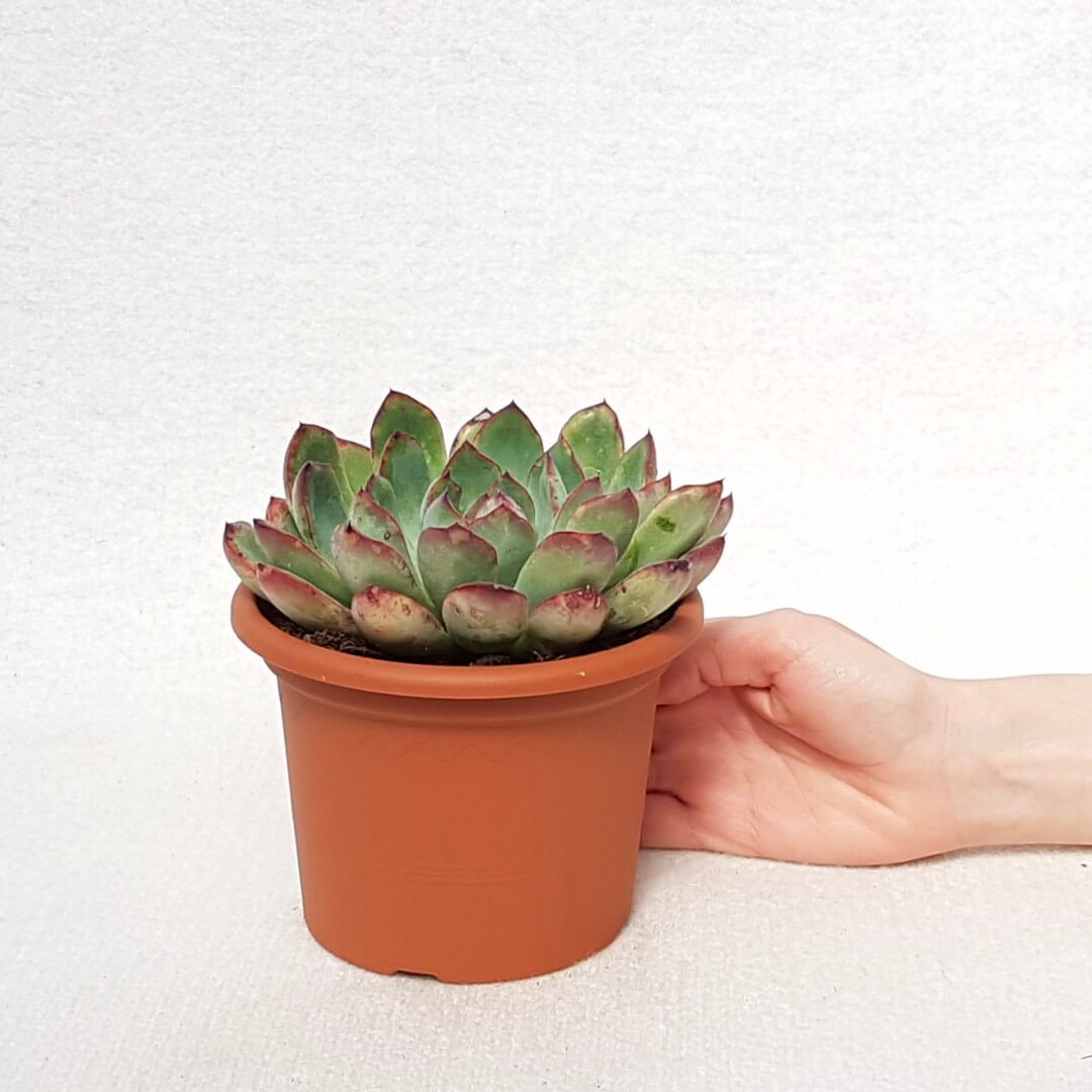 Appartenant à la famille des Crassulaceae, cette plante de Echeveria sitifukumiama est fournie dans un pot Ø 13 avec une étiquette portant le nom botanique.