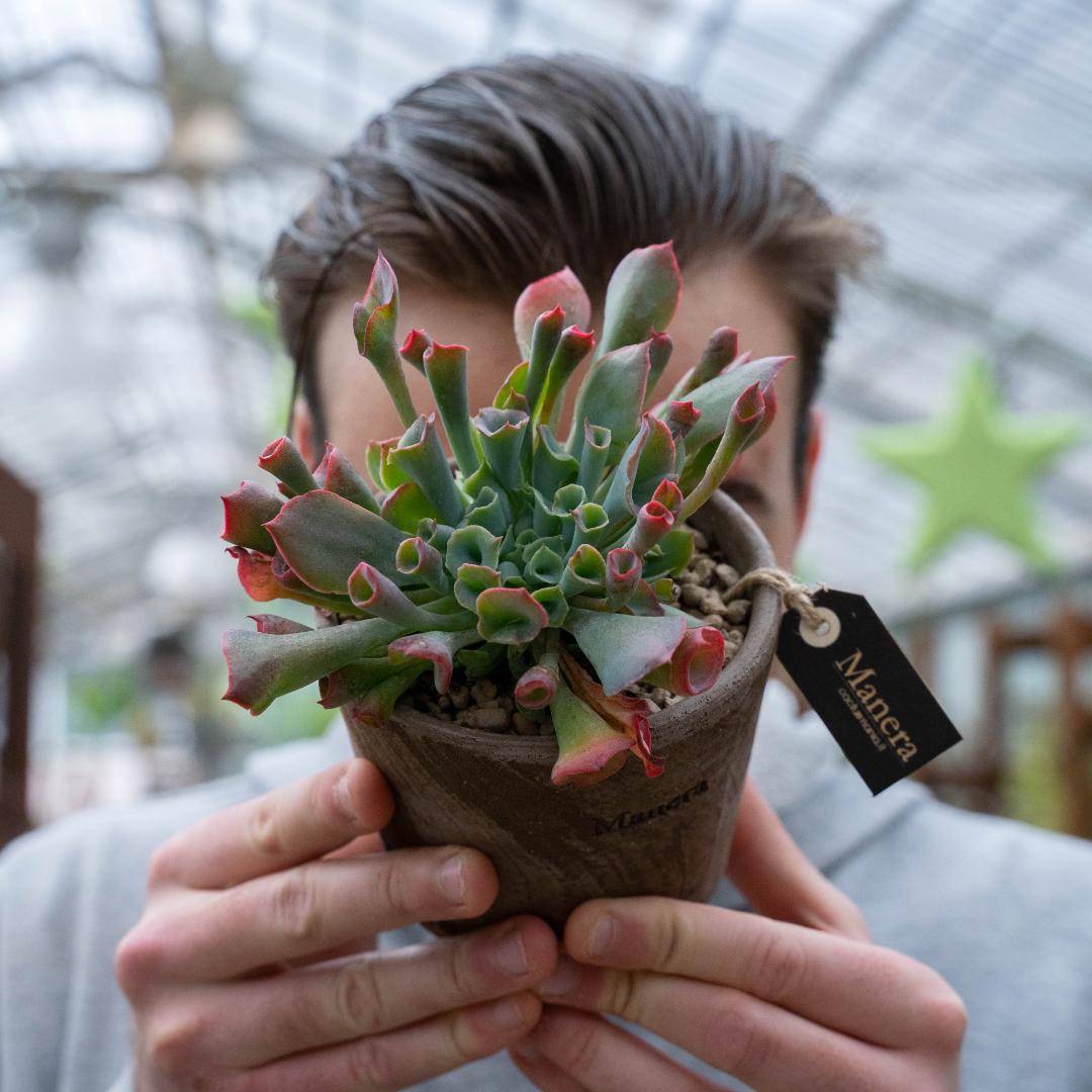Echeveria ‘Trumpet Pinky’ de la ligne Manera, appartenant à la famille des Crassulaceae, est fourni dans l’élégant pot en terre cuite Choco Ø 12 cm avec une étiquette portant le nom botanique.