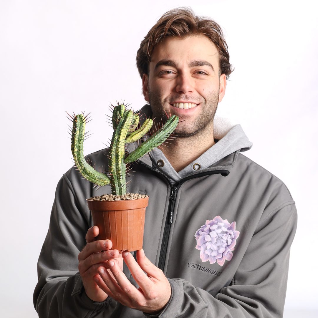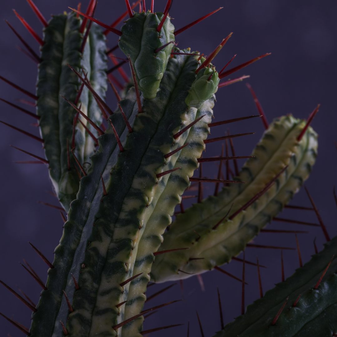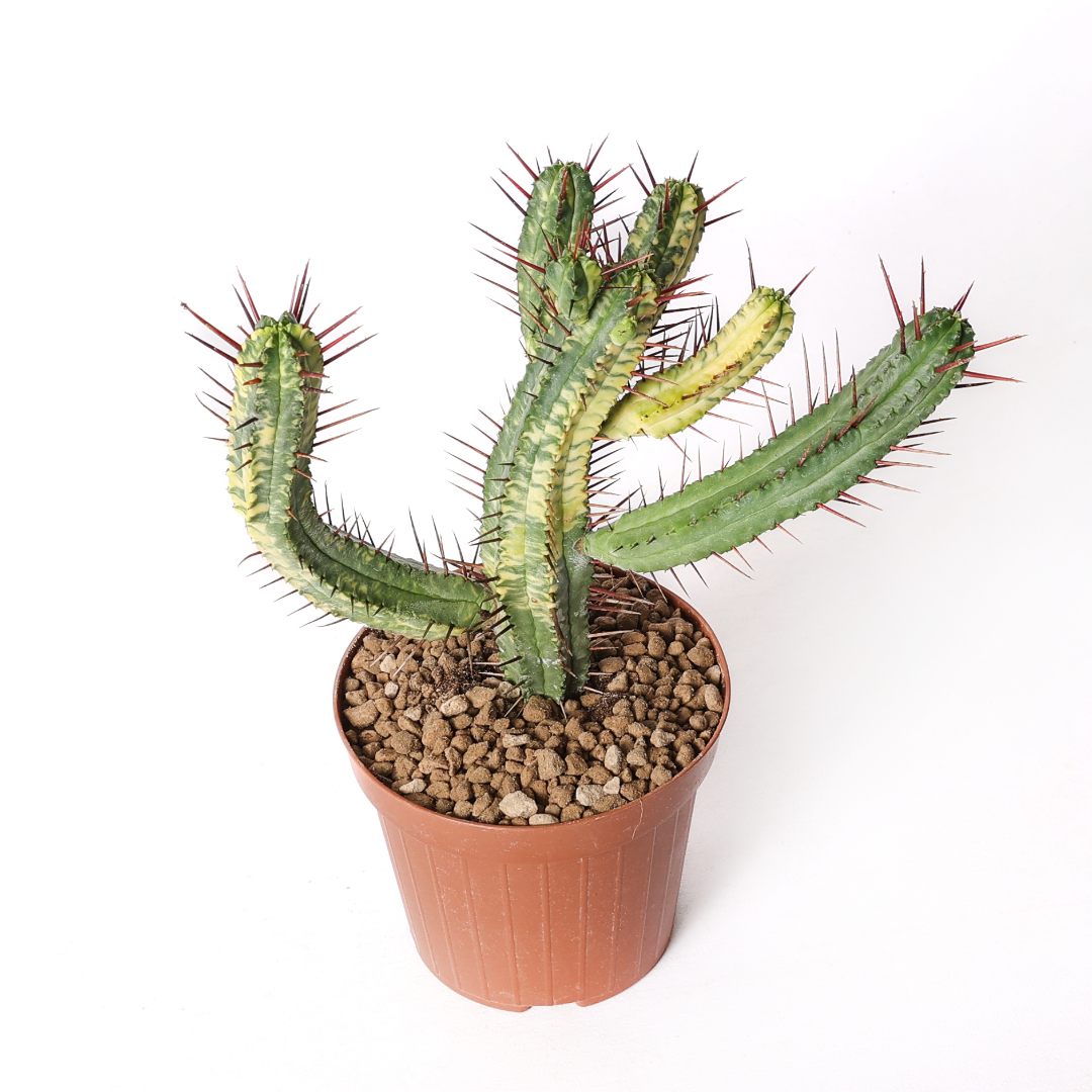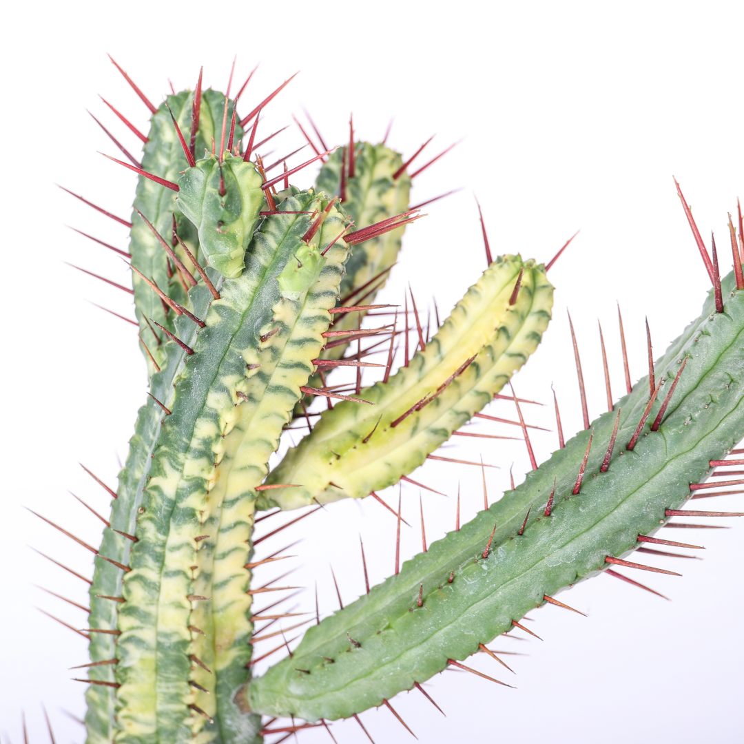 Euphorbia enopla variegata, succulente unique très appréciée, caractérisée par des tiges panachées et des épines d’un rouge intense. Elle demande peu de soins, aime la lumière et craint l’eau stagnante. Parfaite pour les collectionneurs et les amateurs d’Euphorbia.