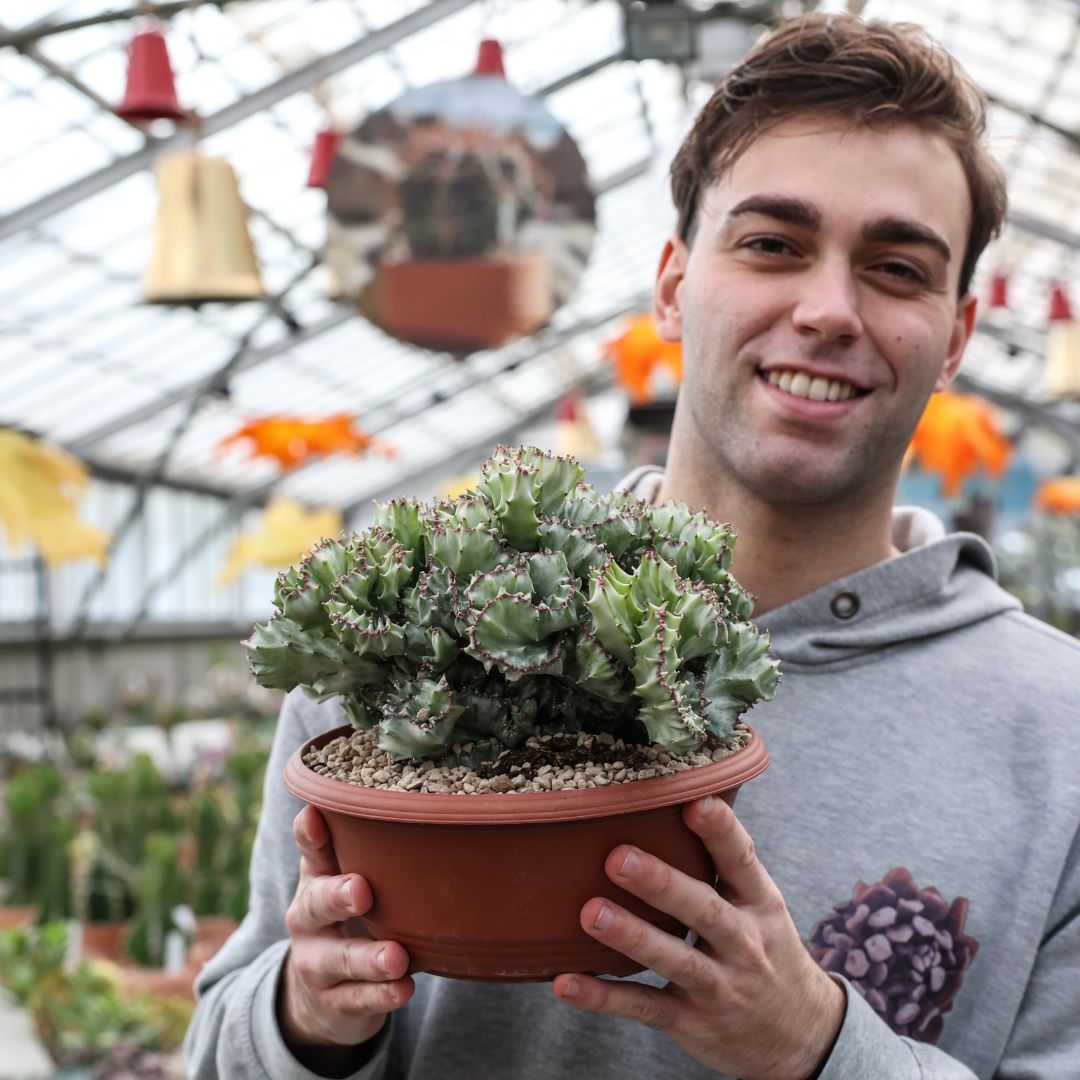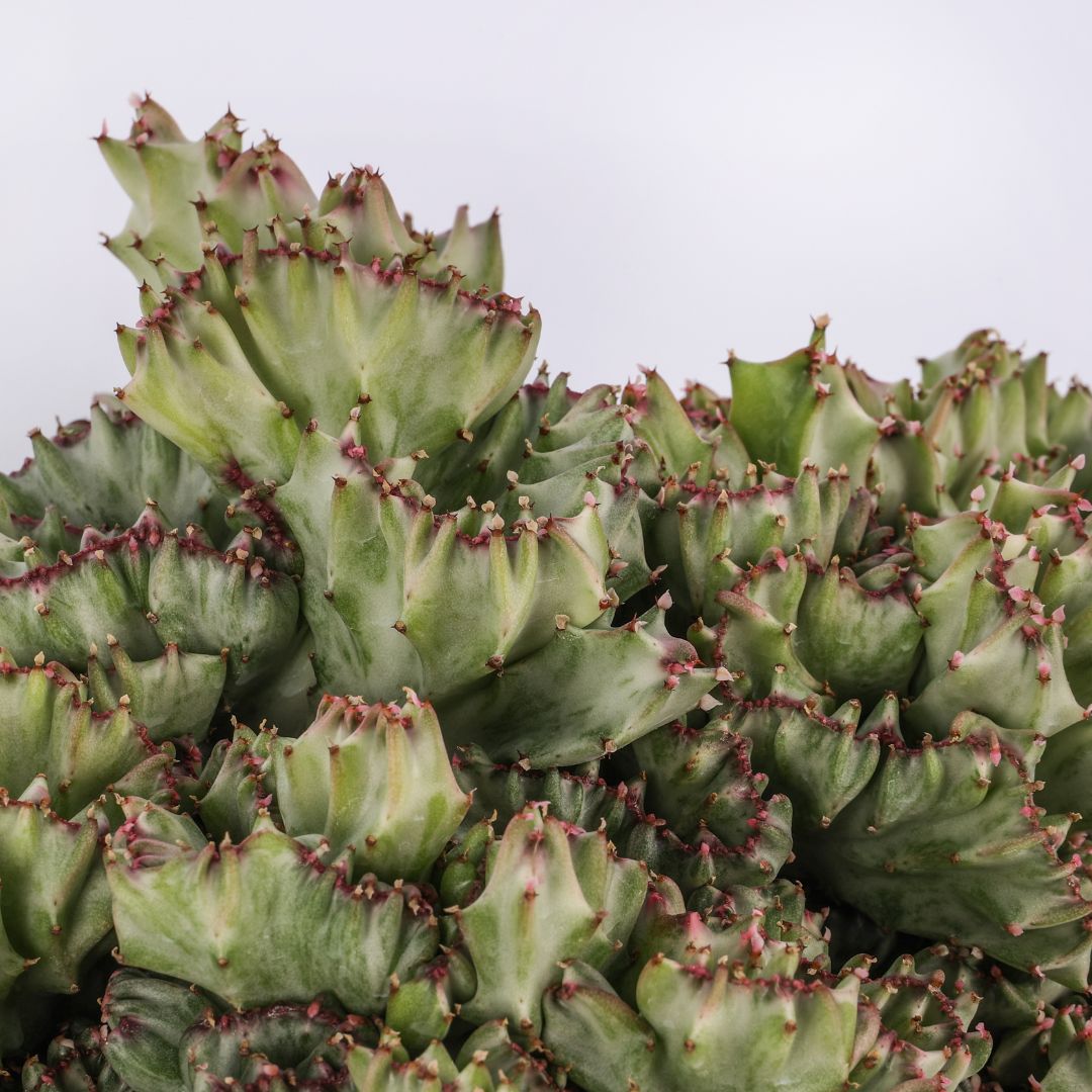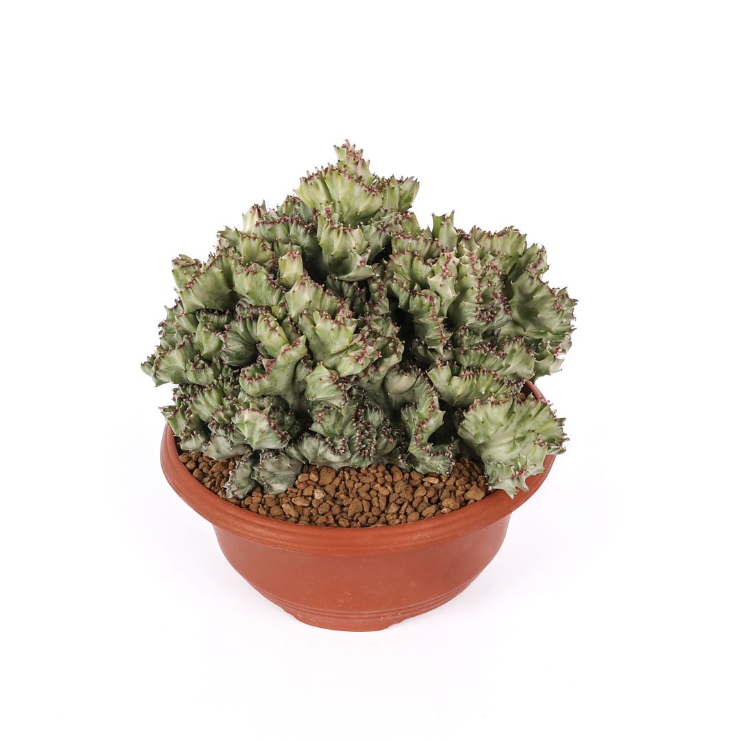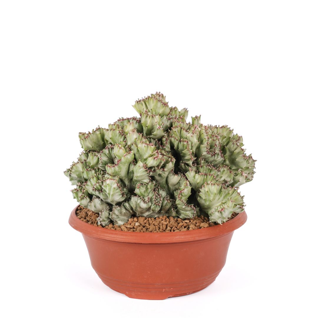 Appartenant à la famille des Euphorbiaceae, cette plante de Euphorbia lactea variegata f. Crestata est fournie dans un pot Ø 23 cm avec une étiquette portant le nom botanique.