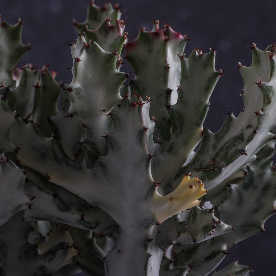 Euphorbia lactea ‘White Ghost’, réputée pour son apparence spectrale et son absence quasi totale de chlorophylle, ce qui en fait une plante à croissance lente et très prisée. Elle demande peu d’entretien, aime la lumière et craint l’eau stagnante. Parfaite pour les collectionneurs de raretés et de curiosités.