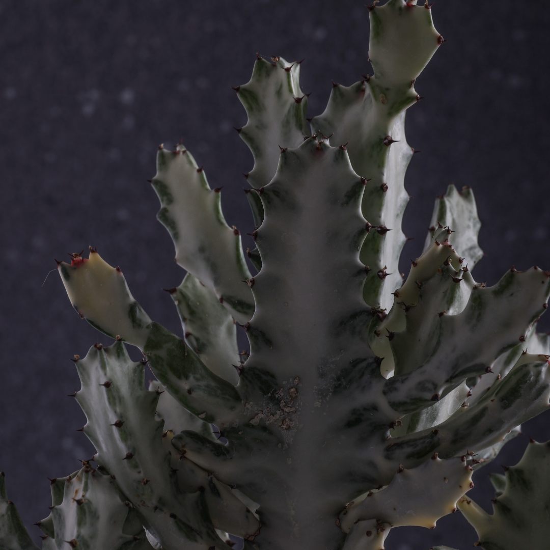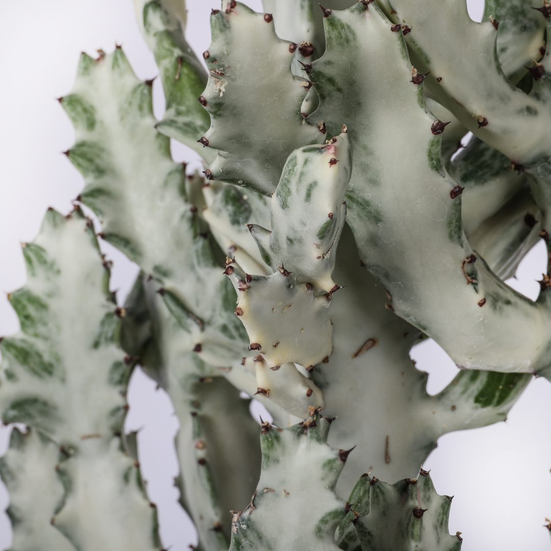 Euphorbia lactea ‘White Ghost’, réputée pour son apparence spectrale et son absence quasi totale de chlorophylle, ce qui en fait une plante à croissance lente et très prisée. Elle demande peu d’entretien, aime la lumière et craint l’eau stagnante. Parfaite pour les collectionneurs de raretés et de curiosités.