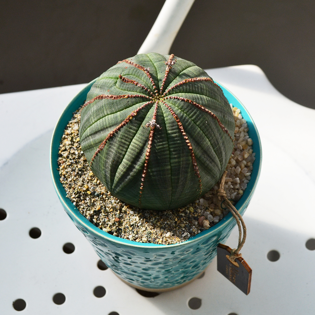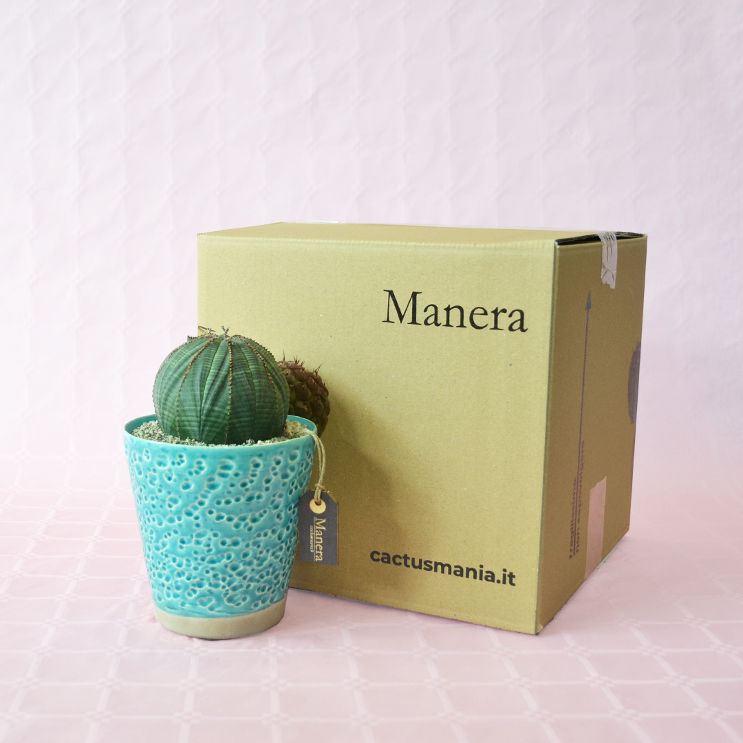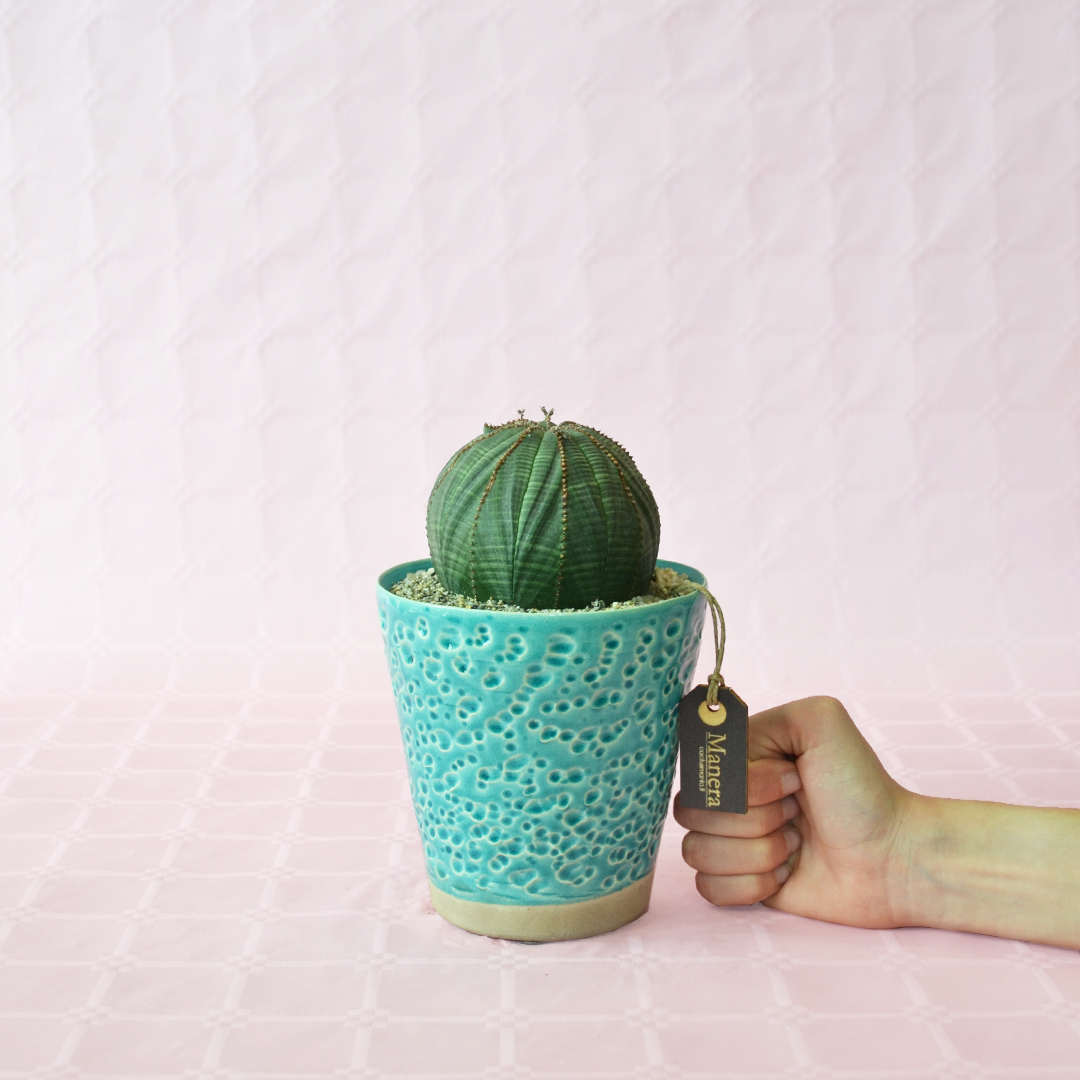 Appartenant à la famille des Euphorbiaceae, cette plante de Euphorbia obesa est fournie dans un pot en céramique bleue Ø 12 avec une étiquette portant le nom botanique.