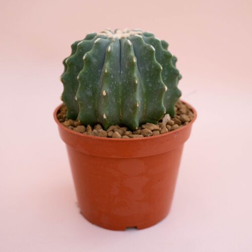 Appartenant à la famille des Cactaceae, cette plante rare de Ferocactus glaucescens nudum mostruosum est fournie dans un pot Ø 20 cm avec une étiquette portant le nom botanique.