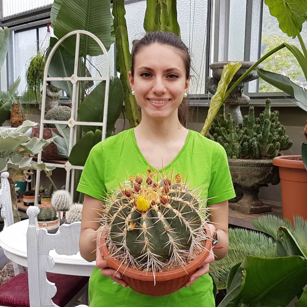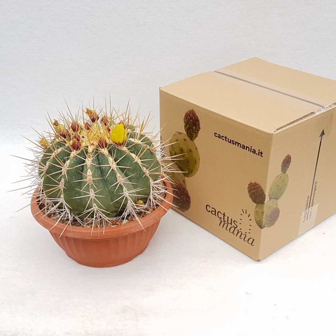 Appartenant à la famille des Cactaceae, cette plante de Ferocactus glaucescens est fournie dans un pot Ø 25 avec une étiquette portant le nom botanique.