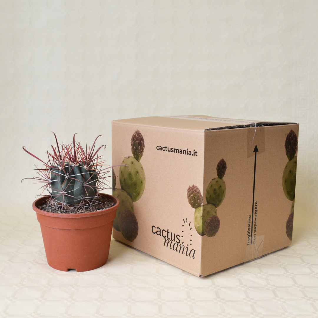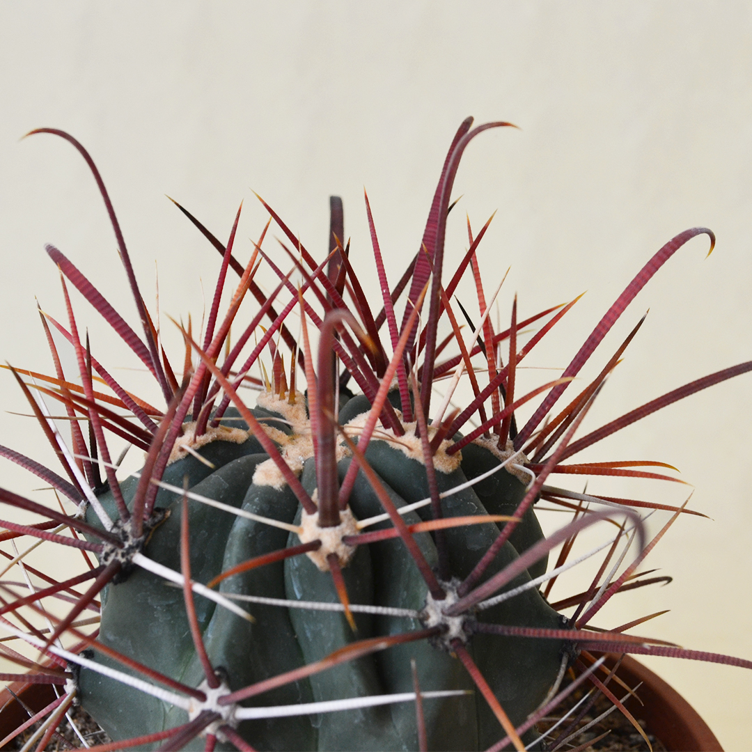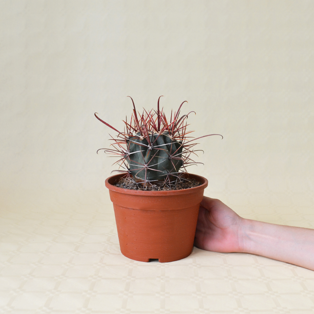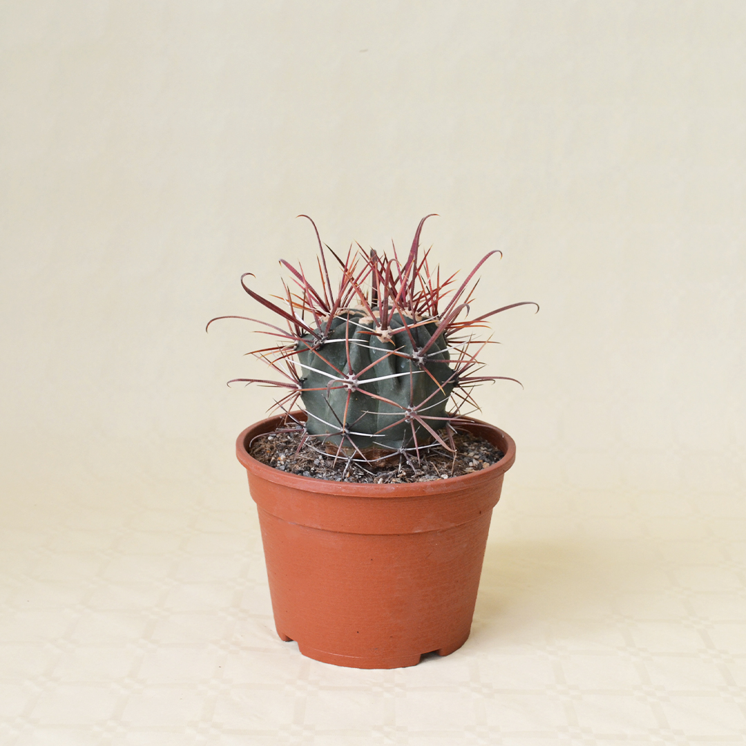 Appartenant à la famille des Cactaceae, cette plante de Ferocactus gracilis est fournie dans un pot Ø 16 avec une étiquette portant le nom botanique.