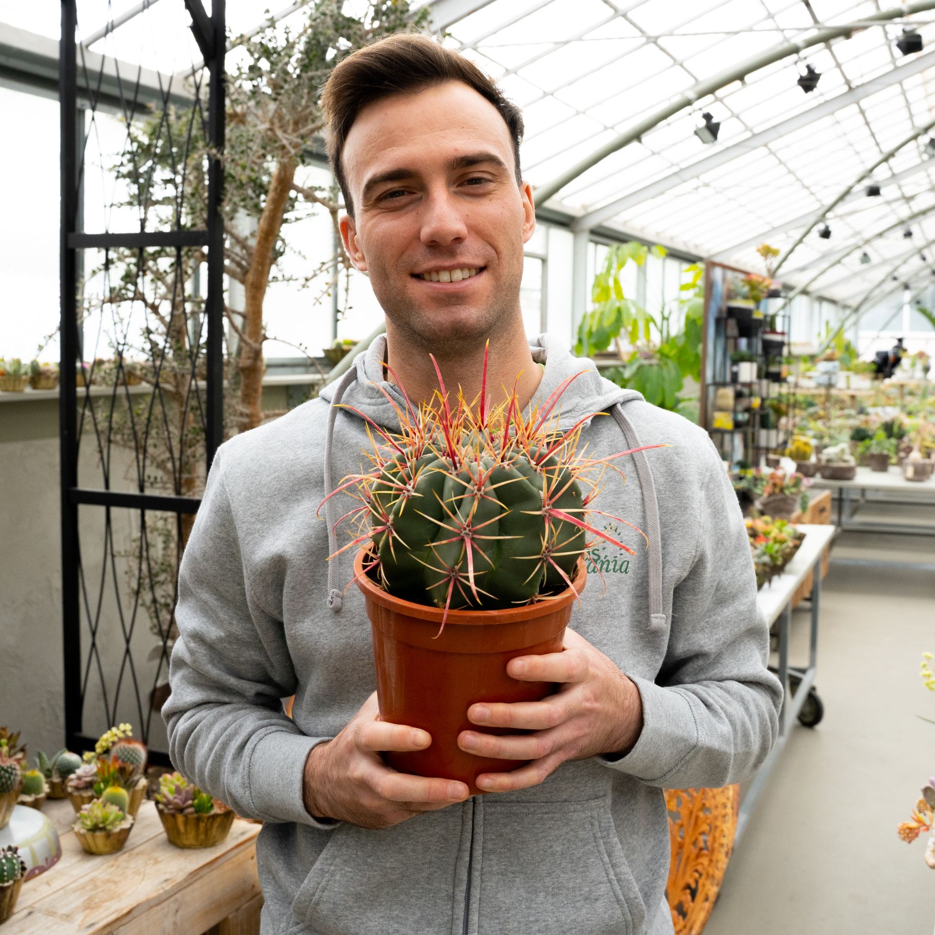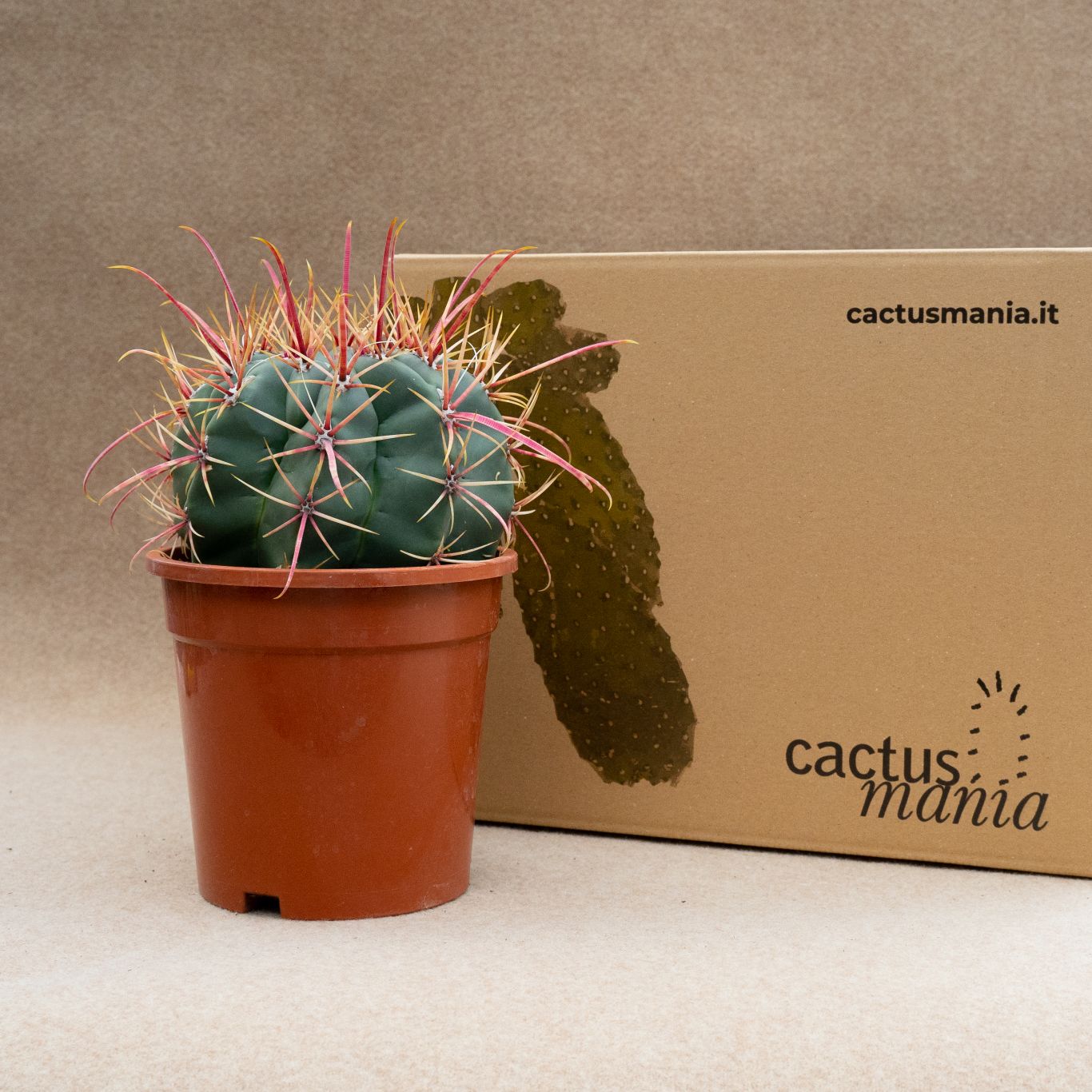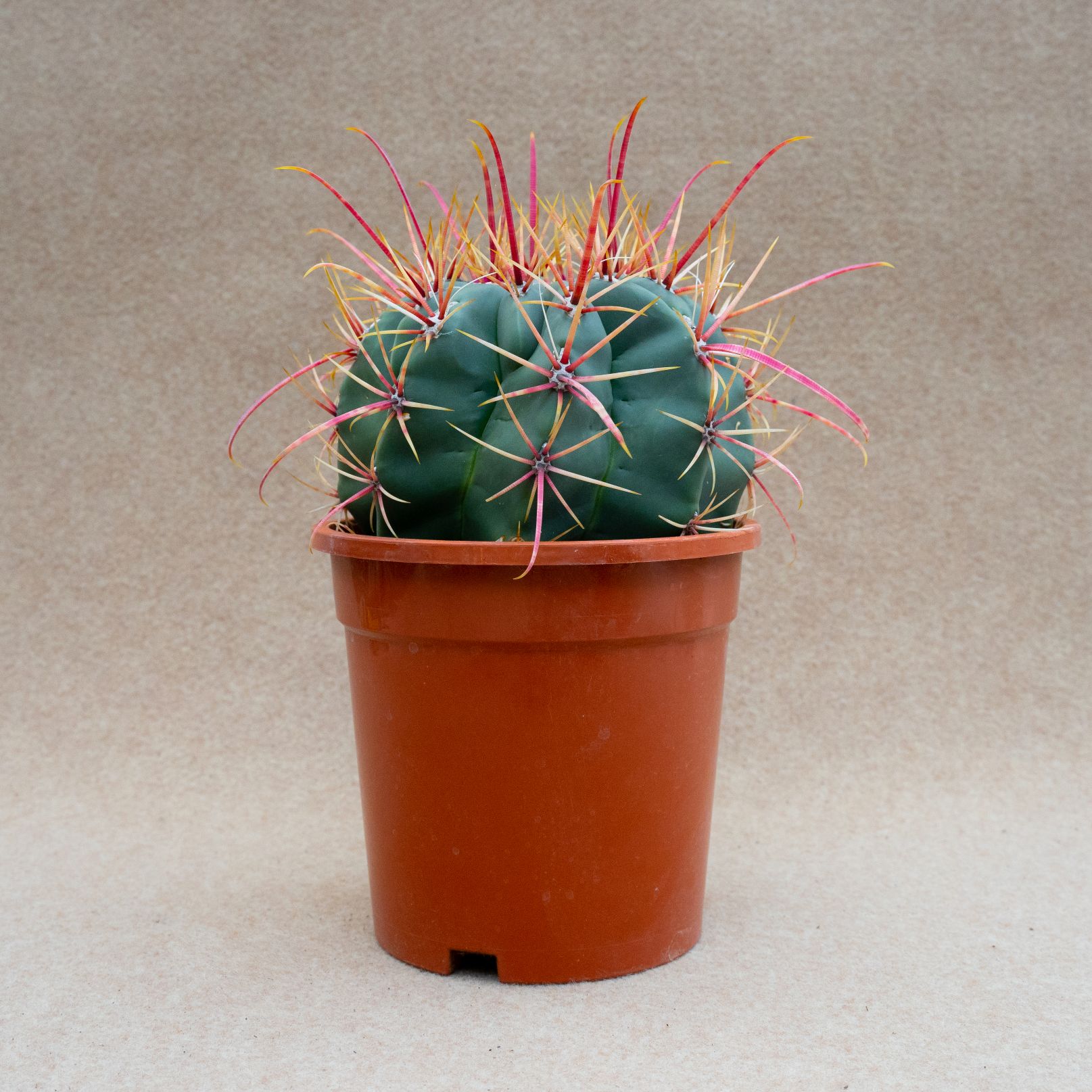 Appartenant à la famille des Cactaceae, cette plante de Ferocactus rectispinus est fournie dans un pot Ø 17 avec une étiquette portant le nom botanique.