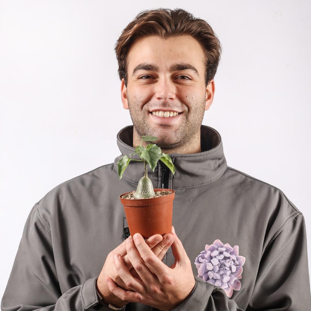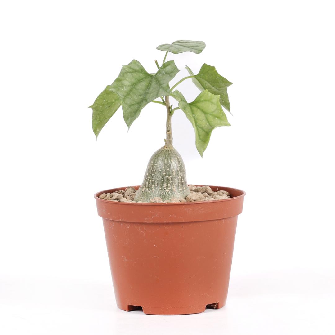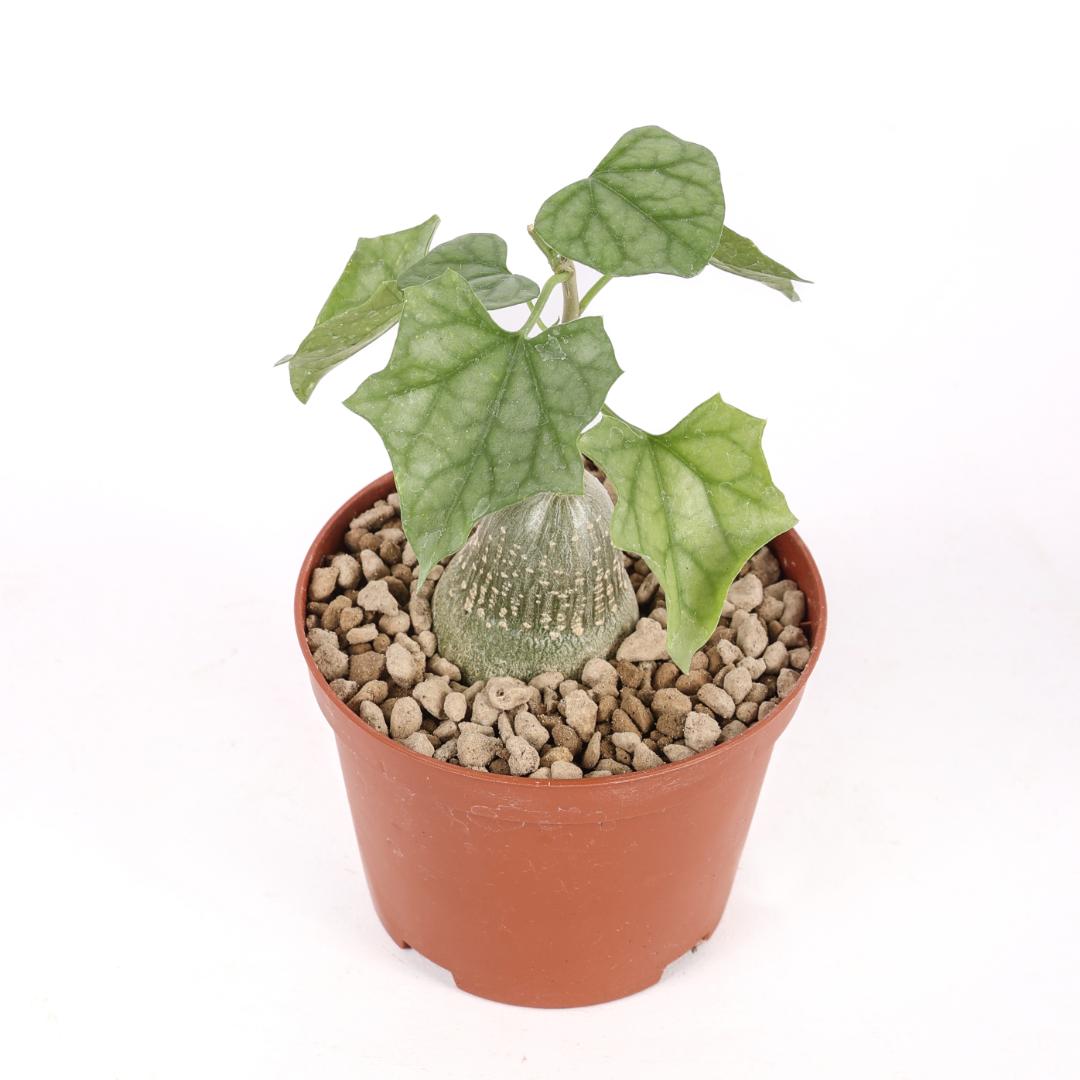 Gerrardanthus macrorhizus, connue pour son caudex en forme de bouteille et ses feuilles fines d’un vert vif. Parfaite pour les amateurs de plantes insolites, rares et curieuses. Elle aime la lumière et les arrosages modérés, surtout pendant la saison de croissance. Elle ne nécessite pas d’eau en hiver, pendant son repos végétatif où elle perdra ses feuilles.