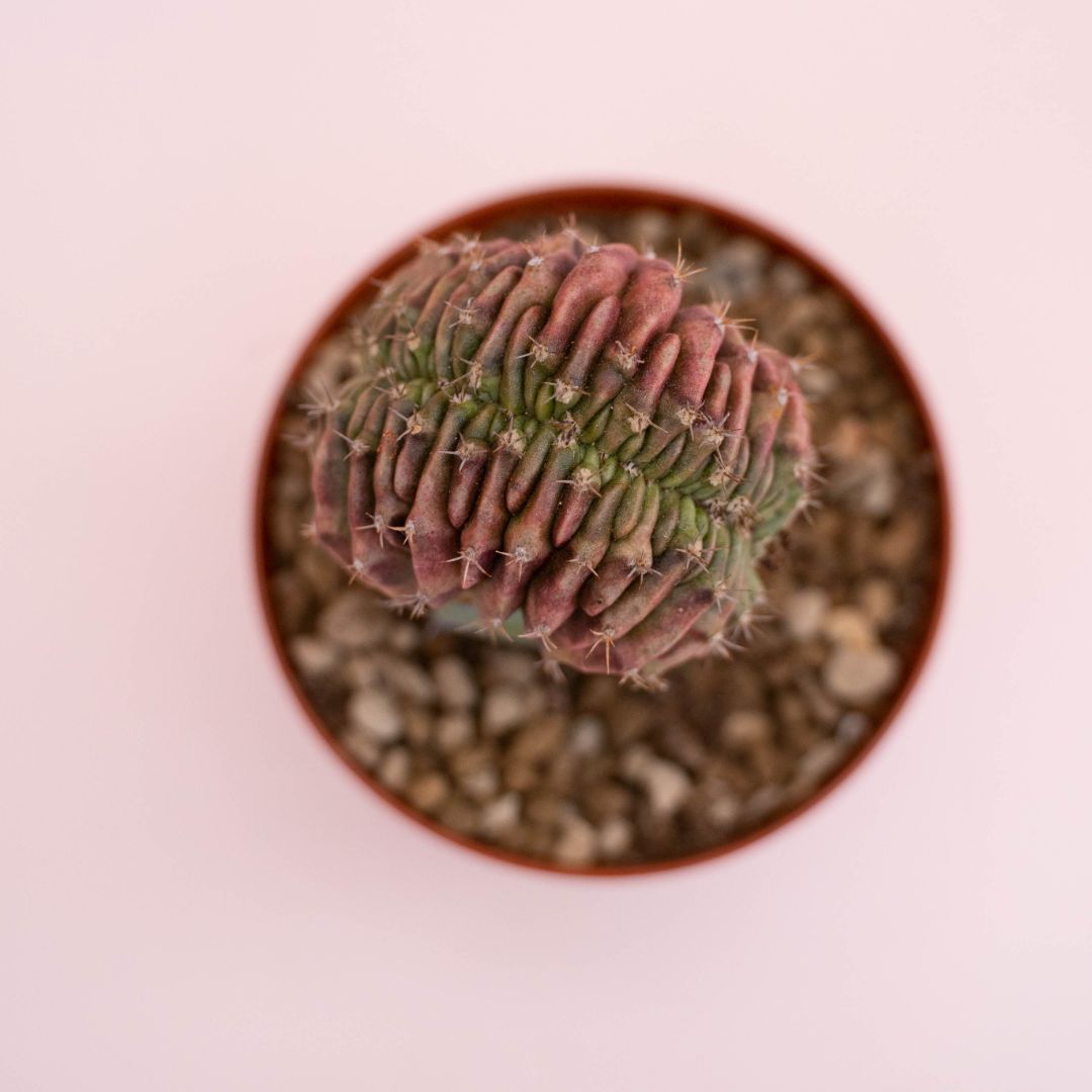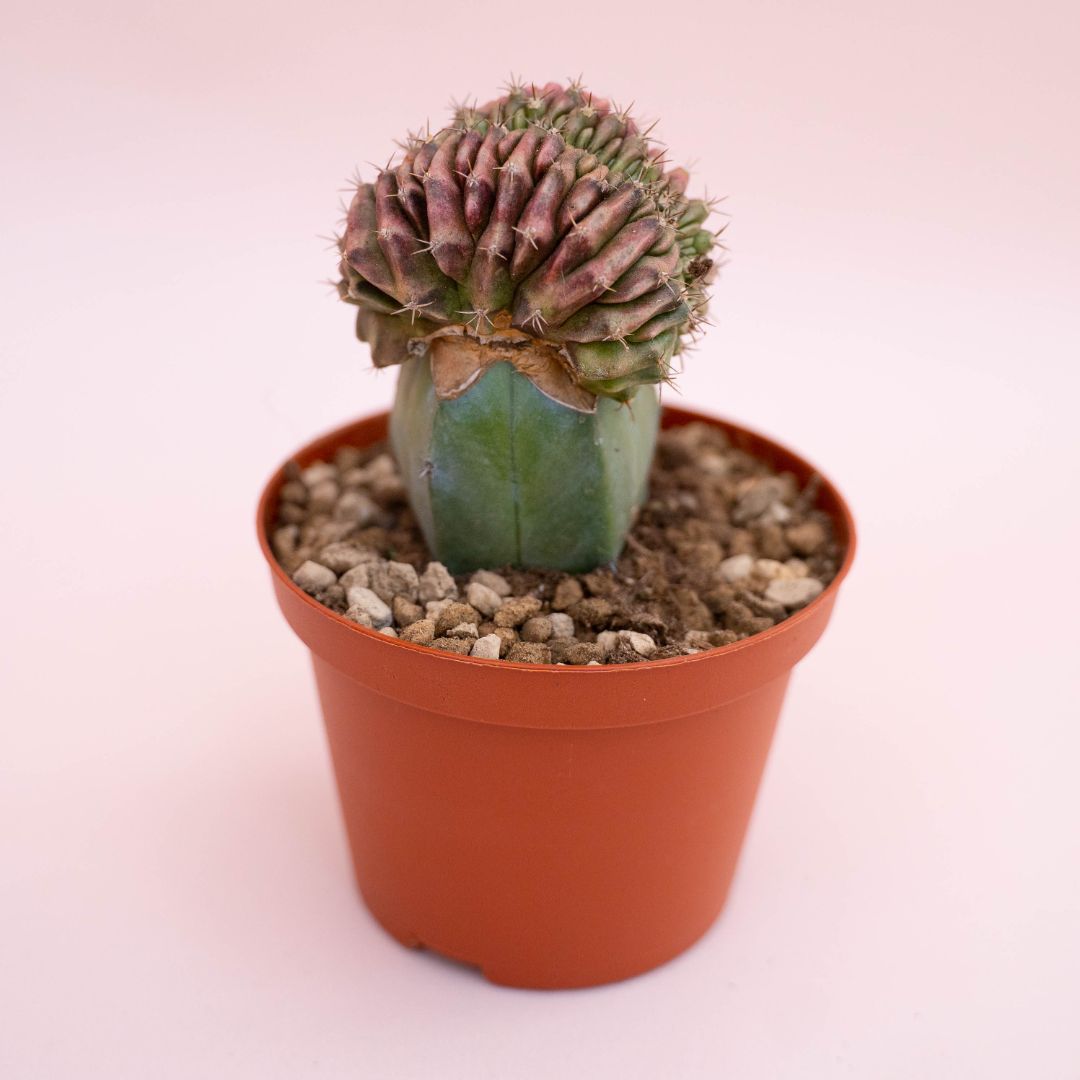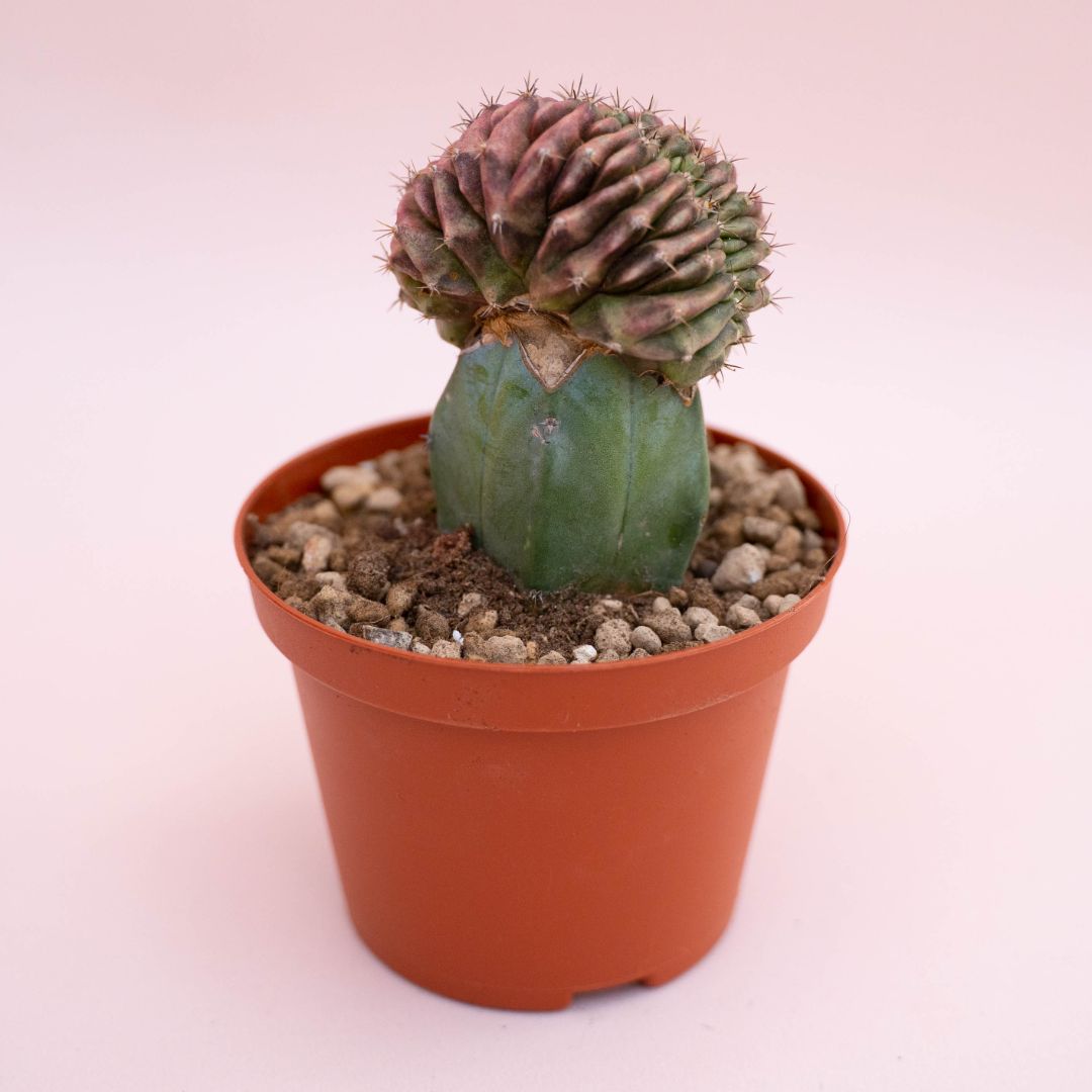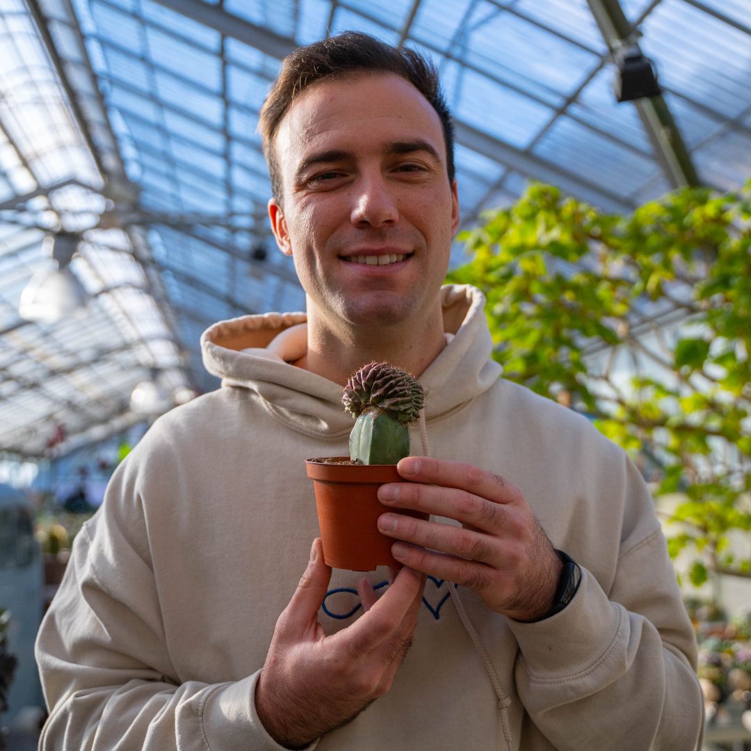Appartenant à la famille des Cactaceae, cette plante rare de Gymnocalycium damsii v. rotundulum est fournie dans un pot Ø 10,5 cm avec une étiquette portant le nom botanique.