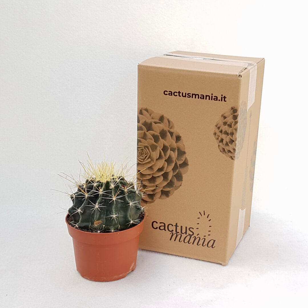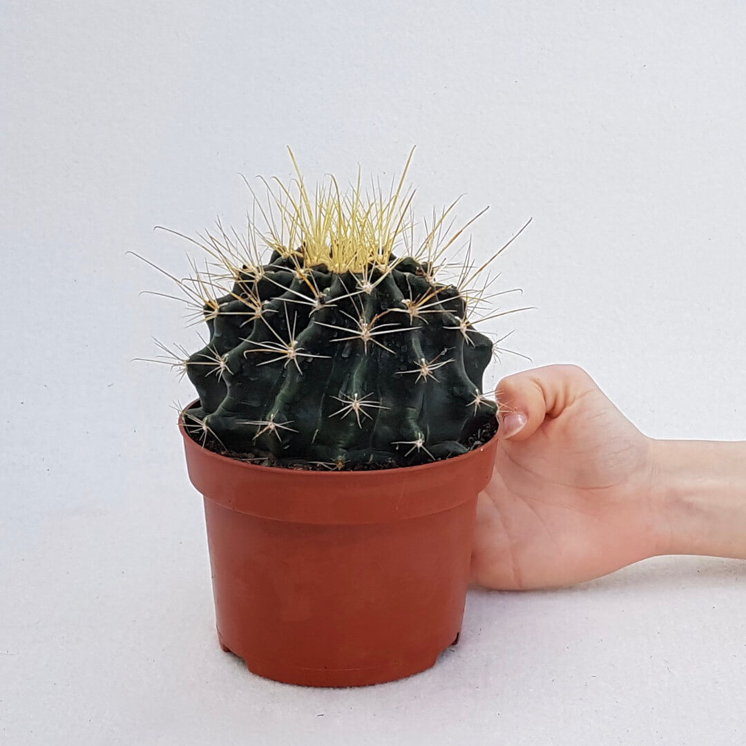 Appartenant à la famille des Cactaceae, cette plante de Hamatocactus hamatacanthus (Ferocactus hamatacanthus) est fournie dans un pot Ø 13 avec une étiquette portant le nom botanique.