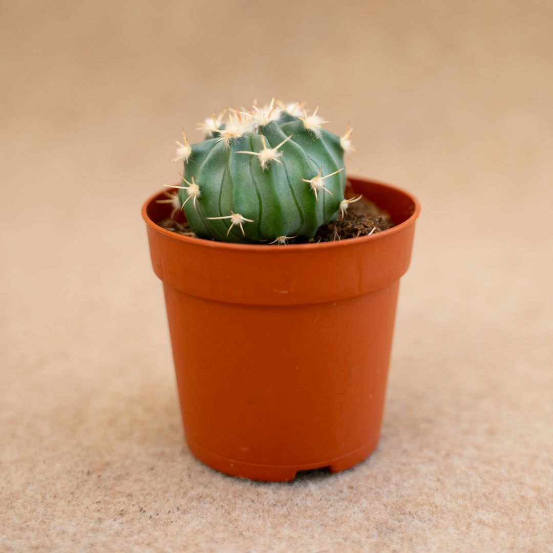 Appartenant à la famille des Cactaceae, cette plante de Homalocephala texensis est fournie dans un pot Ø 6,5 cm avec une étiquette portant le nom botanique.