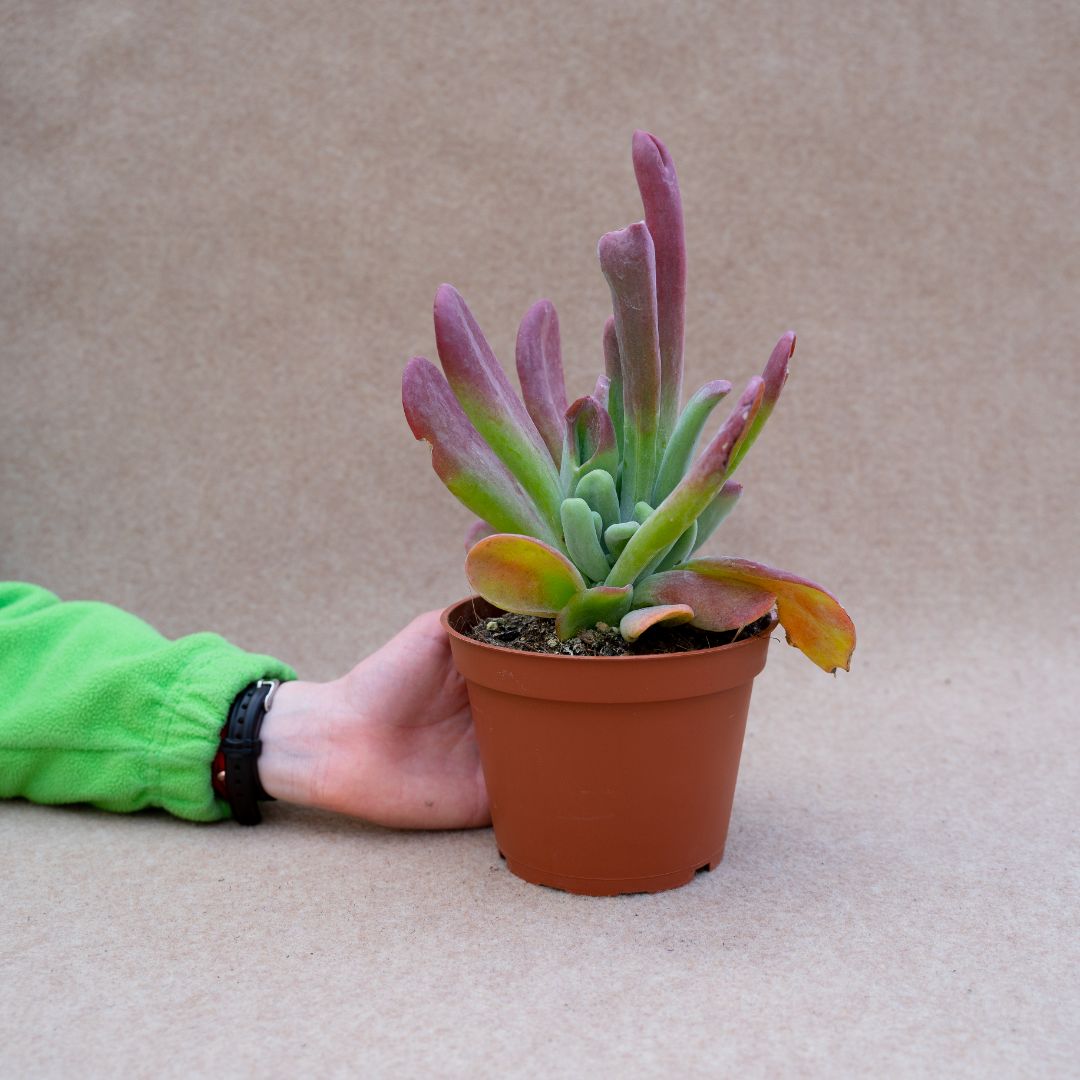Appartenant à la famille des Crassulaceae, cette plante de Kalanchoe oricola est fournie dans un pot Ø 13 avec une étiquette portant le nom botanique.