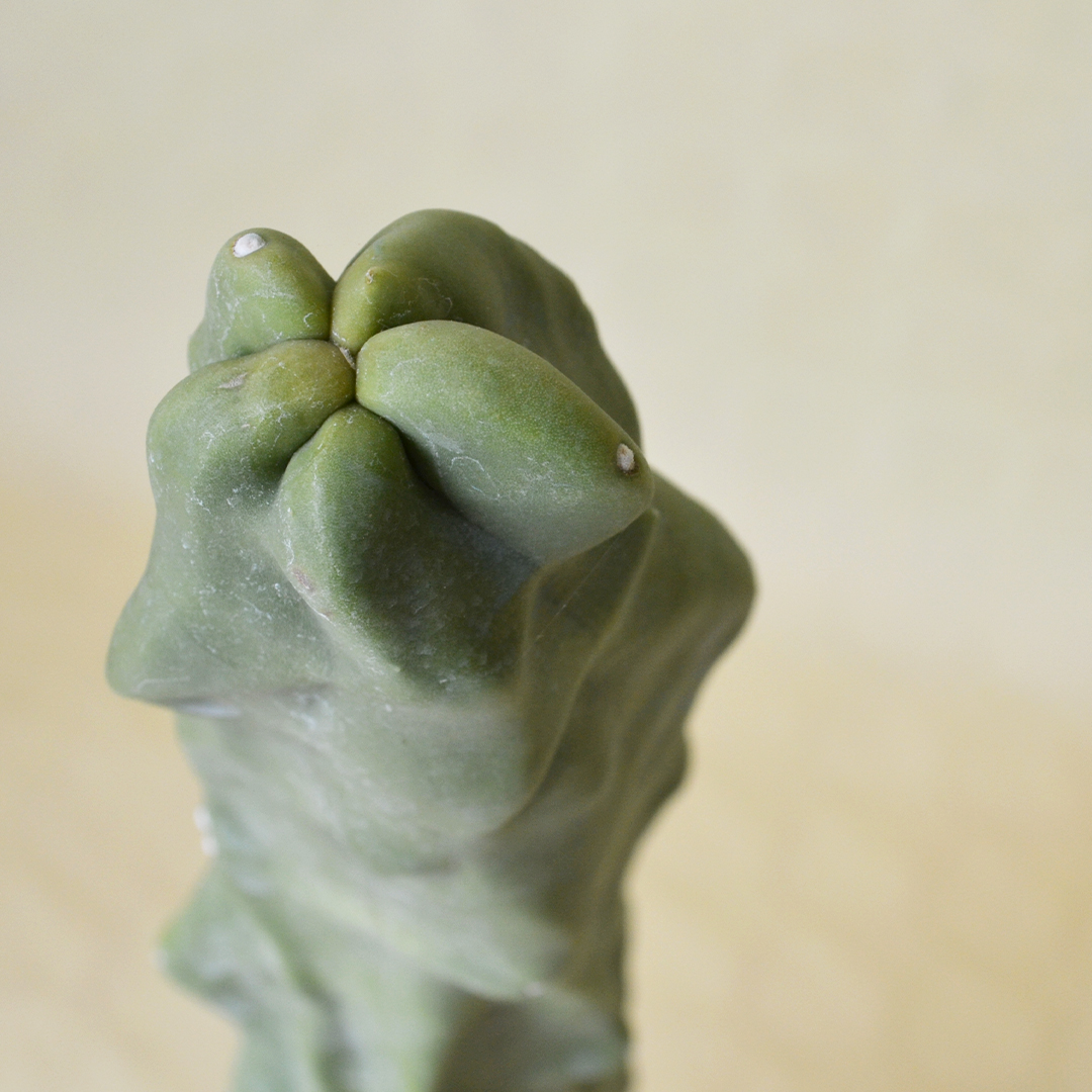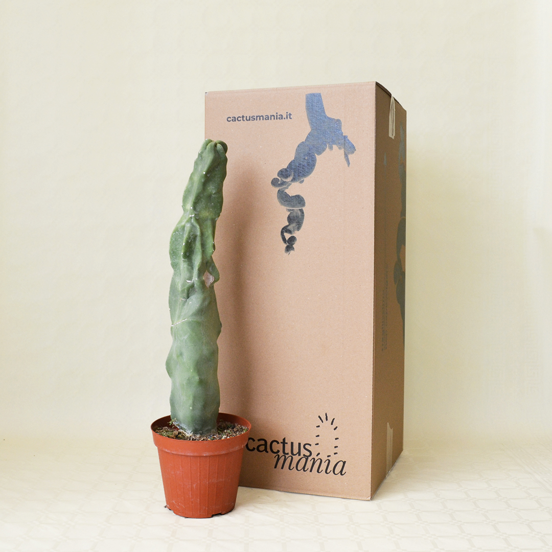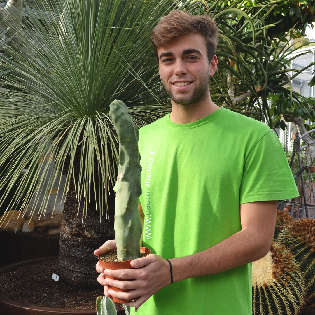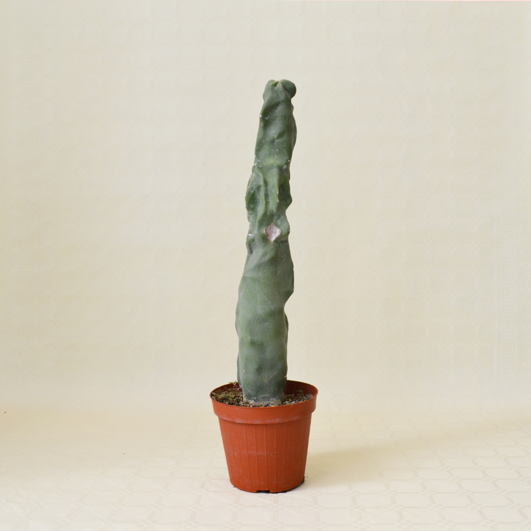 Appartenant à la famille des Cactaceae, cette plante de Lophocereus schottii inermis est fournie dans un pot Ø 14 avec une étiquette portant le nom botanique.