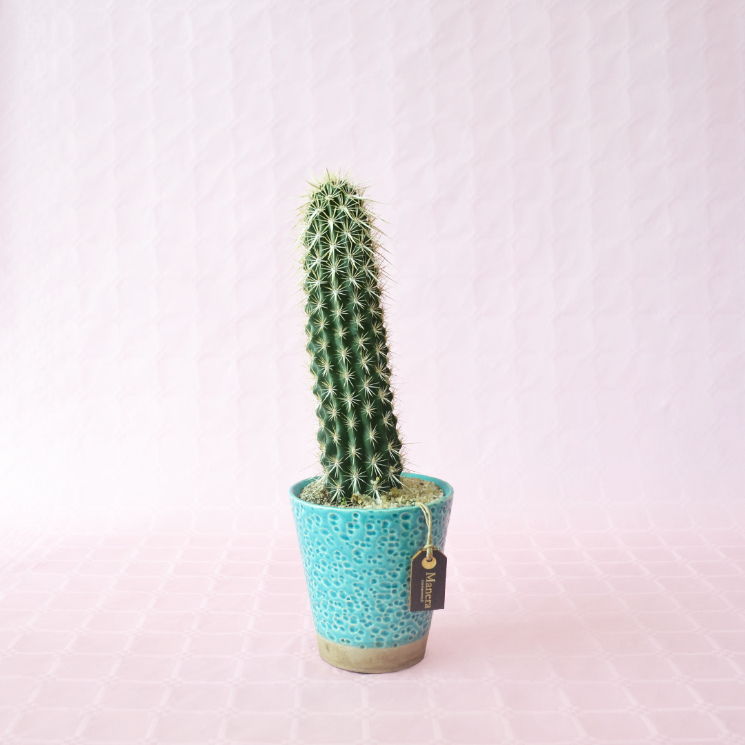 Appartenant à la famille des Cactaceae, cette plante de Machaerocereus erucas est fournie dans un pot en céramique bleu Ø 12 avec une étiquette portant le nom botanique.