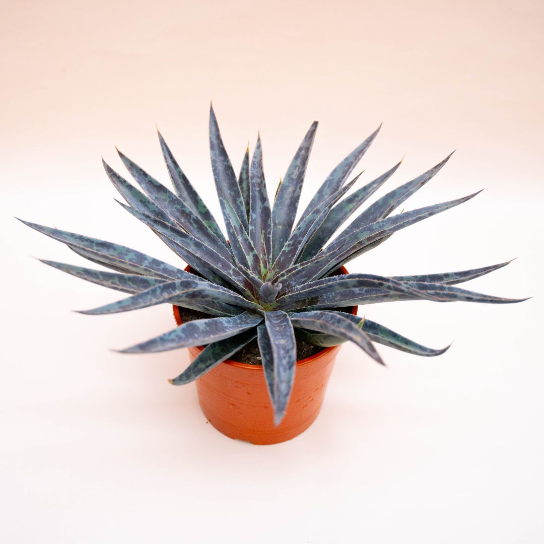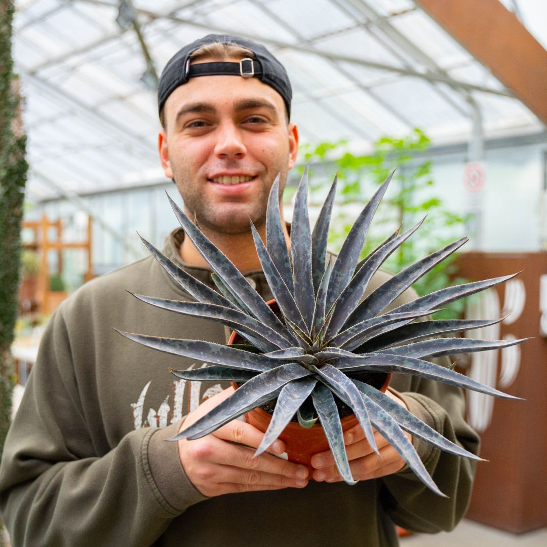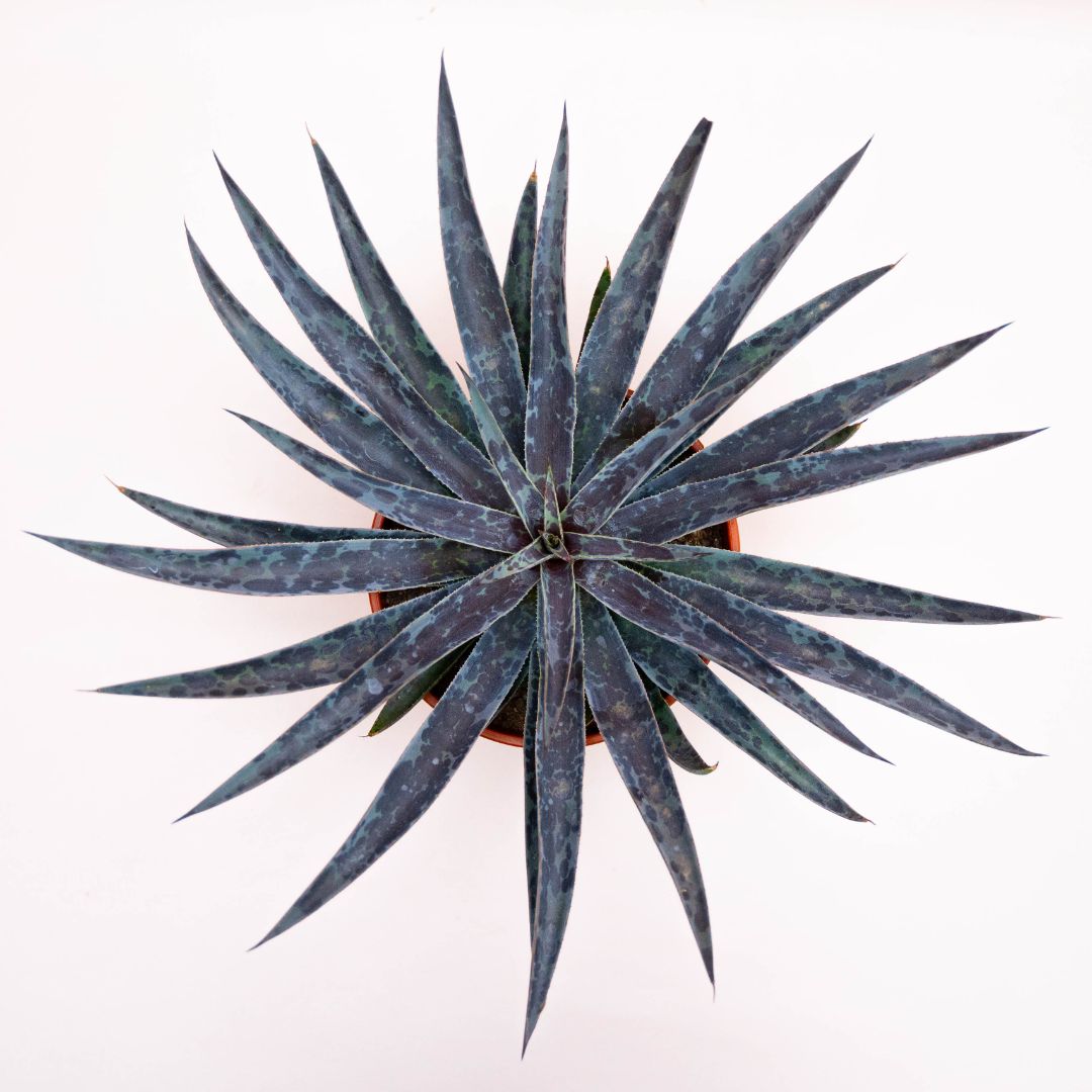 Mad about Mangave ‘Moonglow’ est un hybride entre l’Agave, dont il hérite la forme architecturale large, et le Manfreda, qui offre des colorations uniques. Découvert par hasard dans le désert mexicain, c’est une plante succulente au port bas et large, avec des feuilles arquées vert-bleu argenté tachetées de violet foncé. Ses épines blanches sont douces au toucher. Parfaite pour la culture en pot, elle atteint une hauteur d’environ 20-25 cm et une largeur de 40-51 cm.