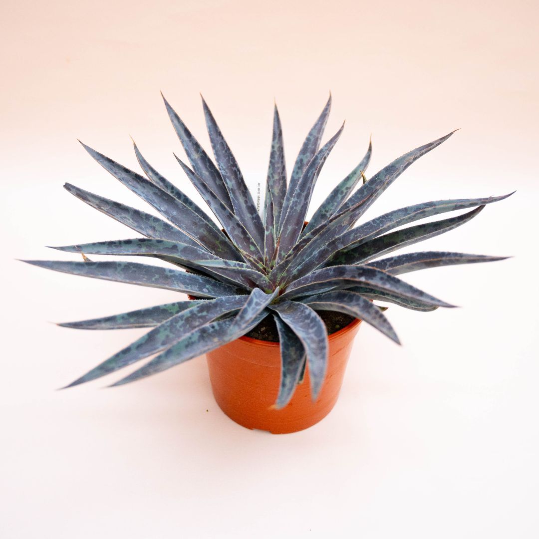 Appartenant à la famille des Asparagaceae, cette plante de Mangave Moonglow est fournie dans un pot Ø 17 cm avec une étiquette portant le nom botanique.
