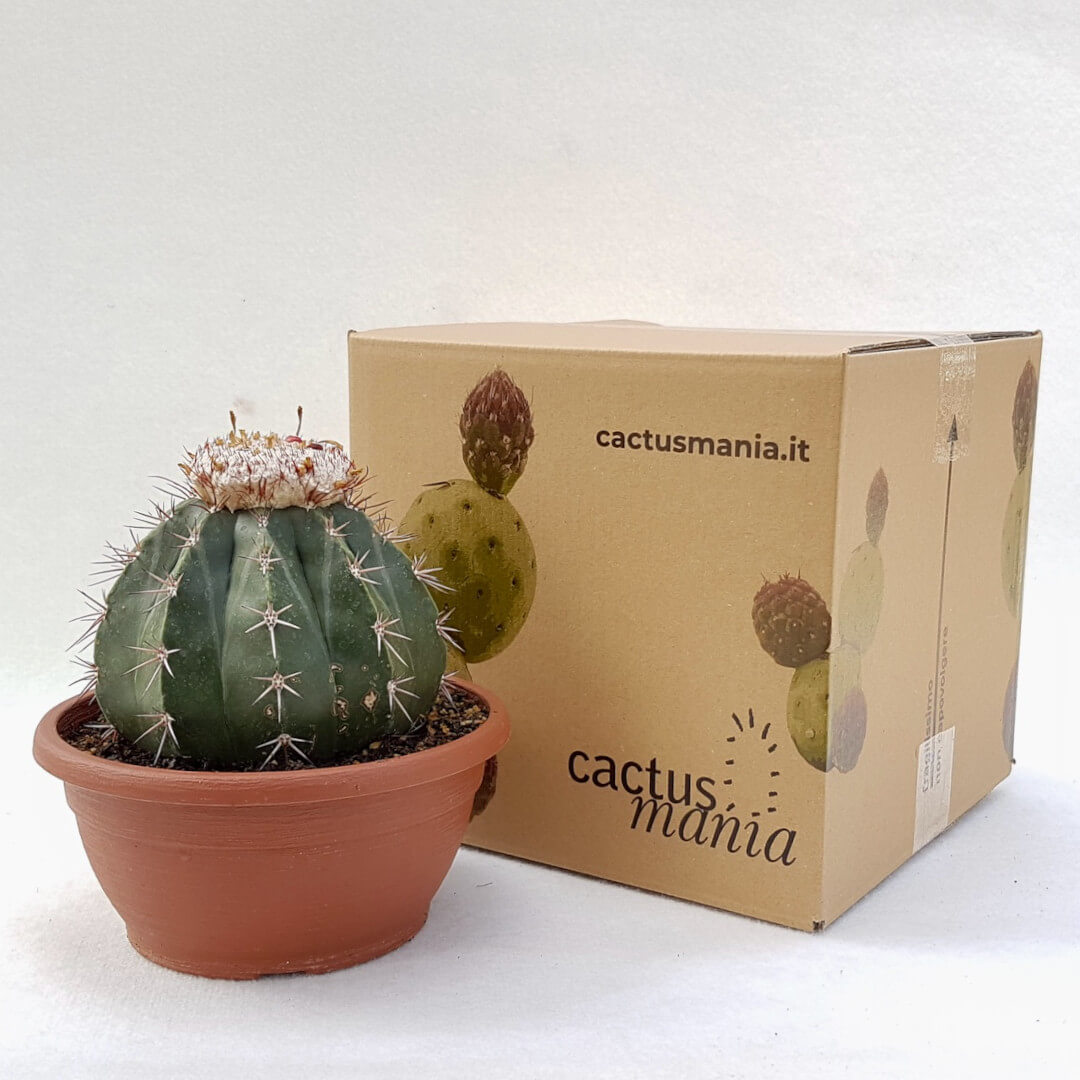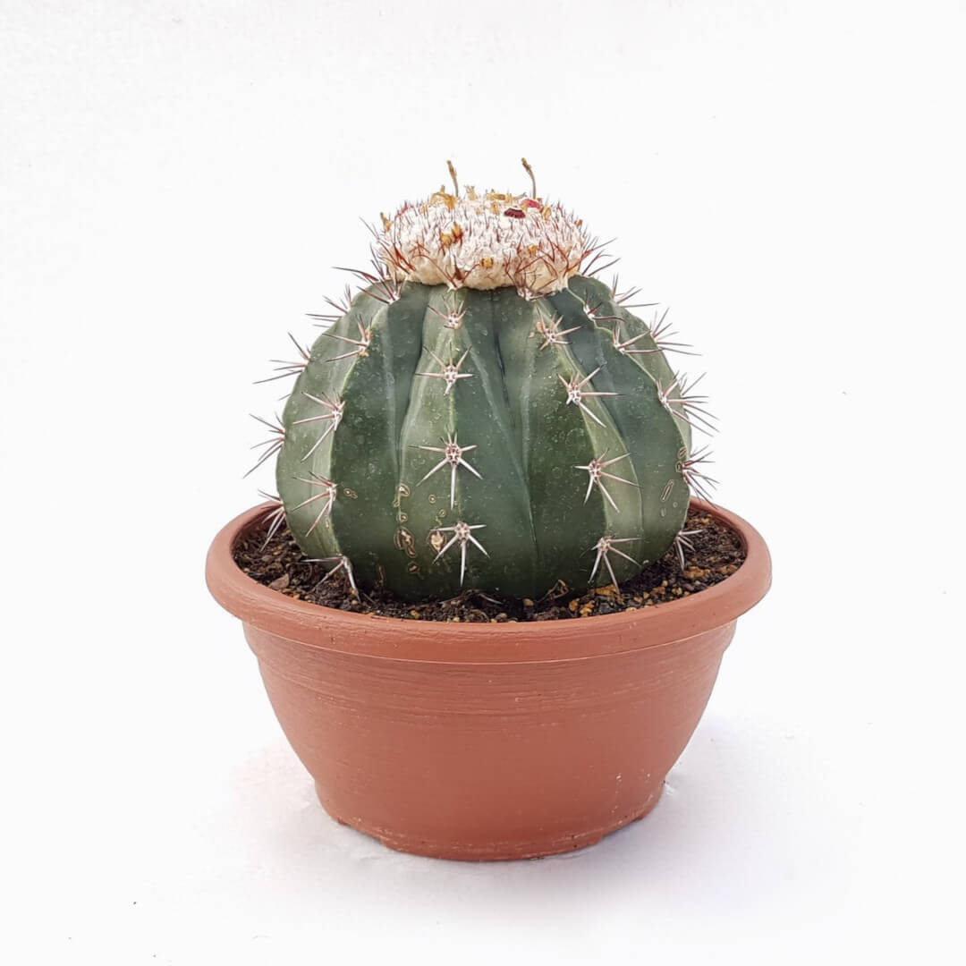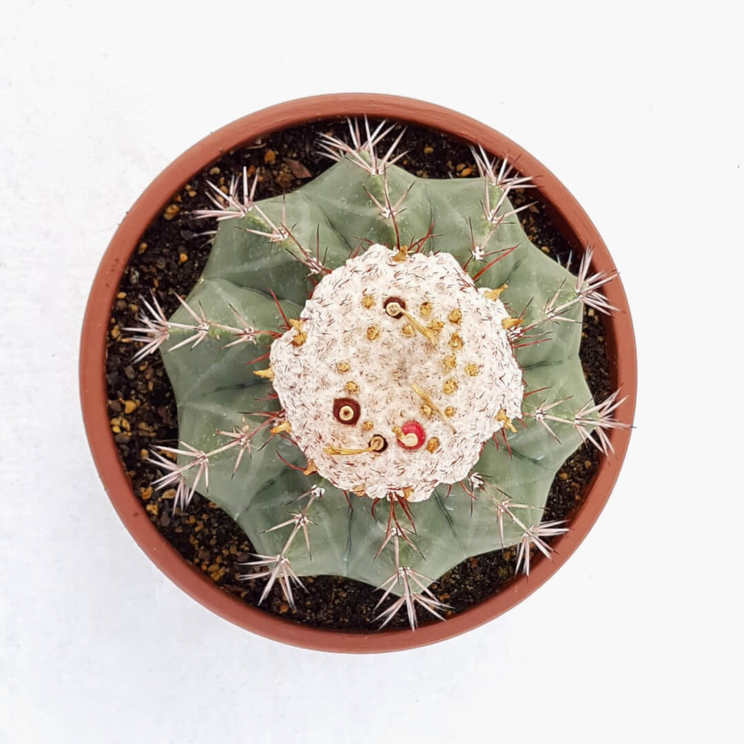 Appartenant à la famille des Cactaceae, cette plante de Melocactus maxonii est fournie dans un pot Ø 20 avec une étiquette portant le nom botanique.