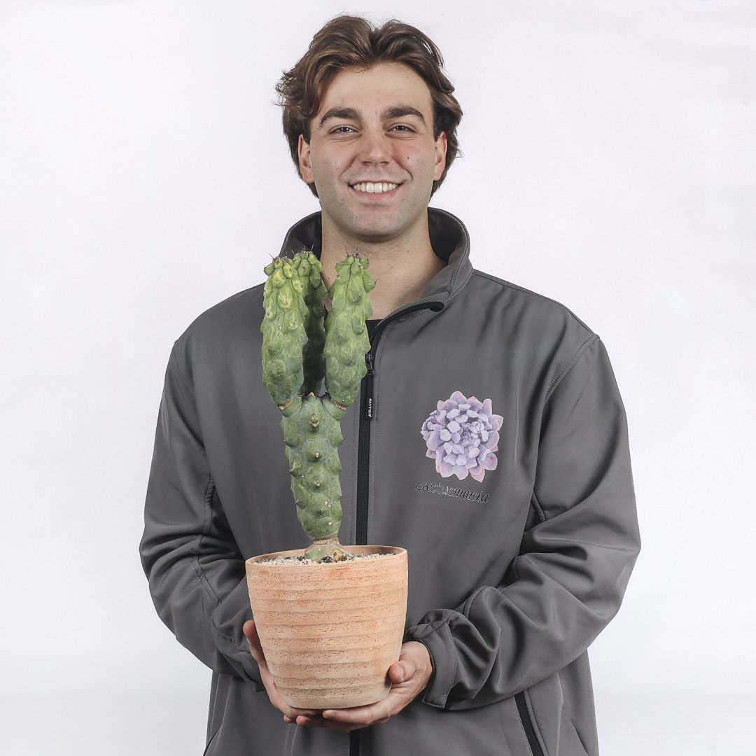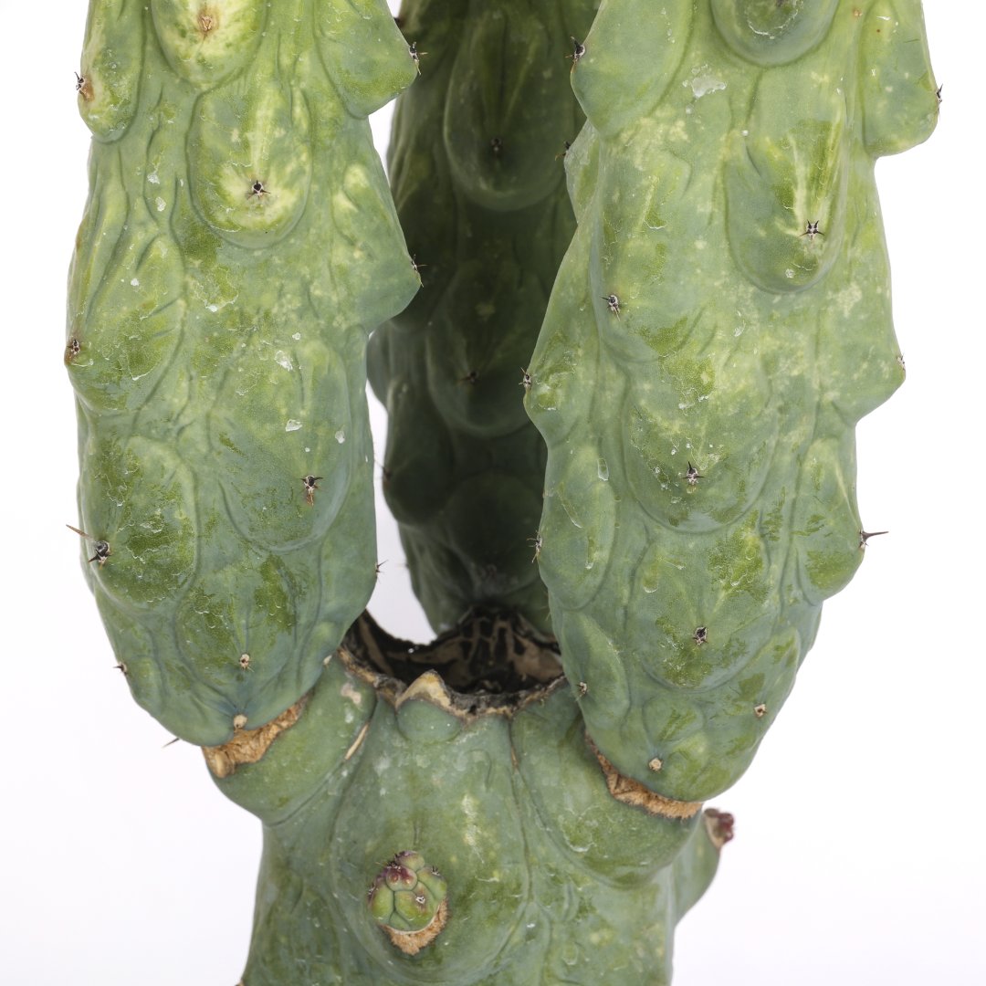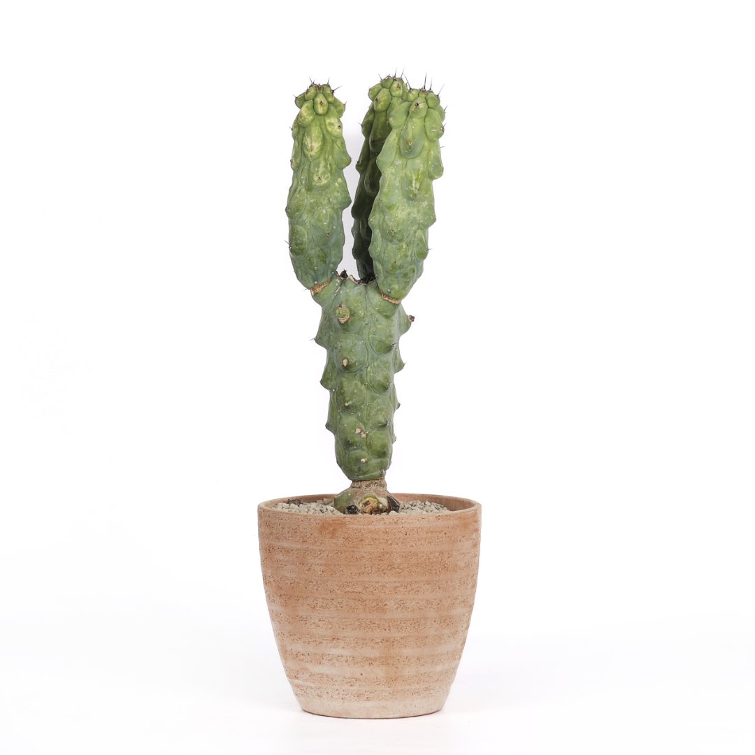 Myrtillocactus Fukurokuryuzinboku panaché est l’une des cultivars les plus rares, recherchées, bizarres et visuellement spectaculaires de l’ensemble des cactus. Elle associe une mutation morphologique à une mutation chromatique. « Fukurokuryuzinboku » est le nom japonais qui fait référence à l’une des sept divinités de la chance. Elle nécessite peu d’entretien, aime la lumière et craint l’eau stagnante. Parfaite pour les collectionneurs et les amateurs de raretés.