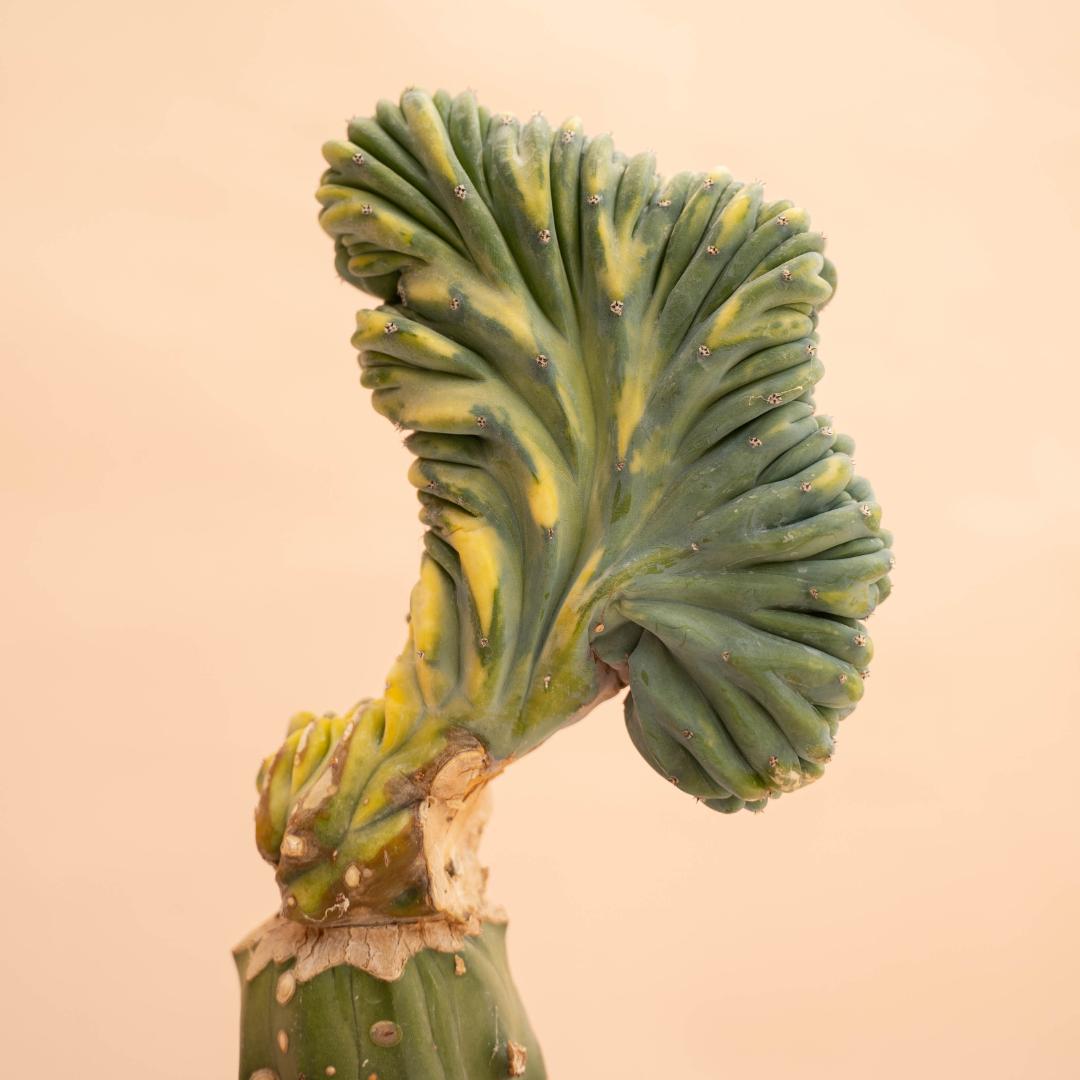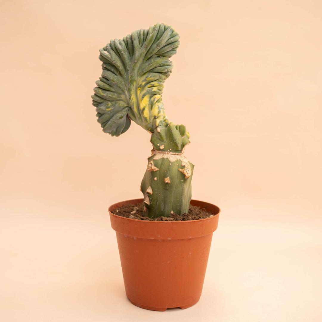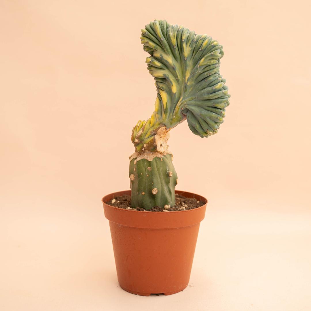Cette cactacée originaire du Mexique présente une forme en éventail typique du Myrtillocactus geometrizans à crête et une belle panachure qui la rend unique.
