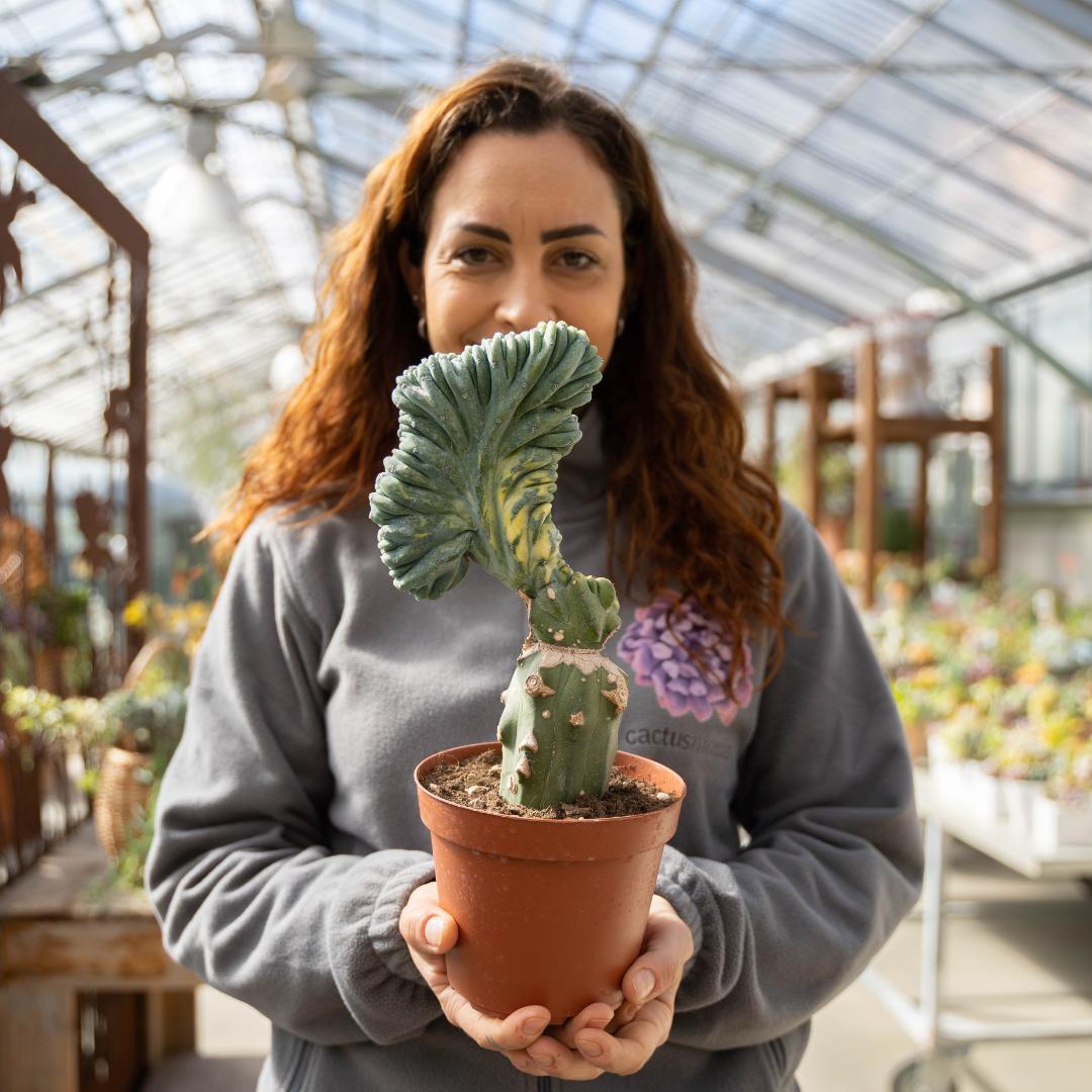 Appartenant à la famille des Cactaceae, cette plante rare de Myrtillocactus geometrizans crestato variegato est fournie dans un pot Ø 14 cm avec une étiquette portant le nom botanique.