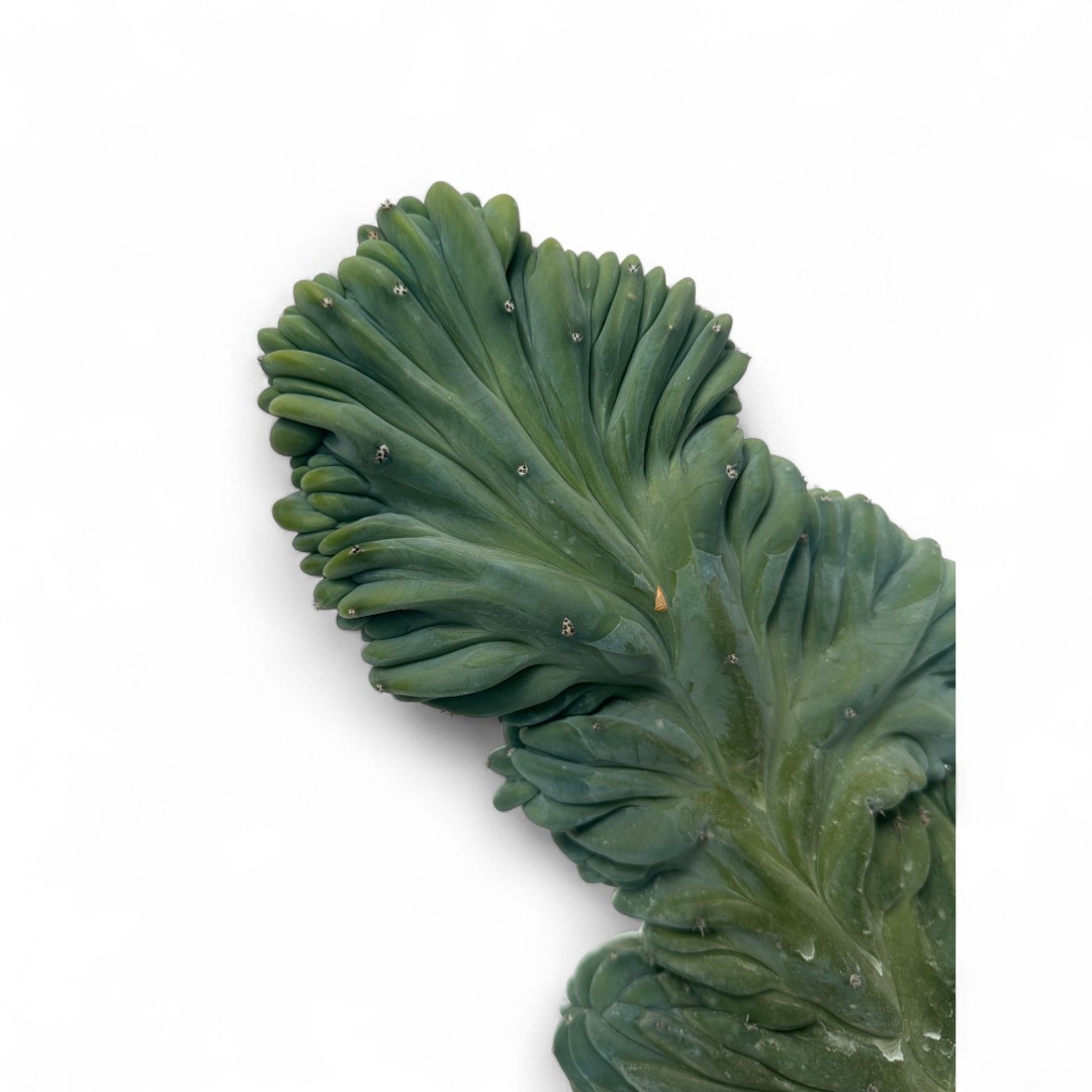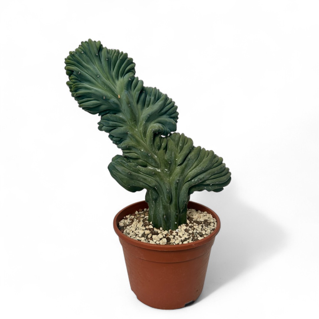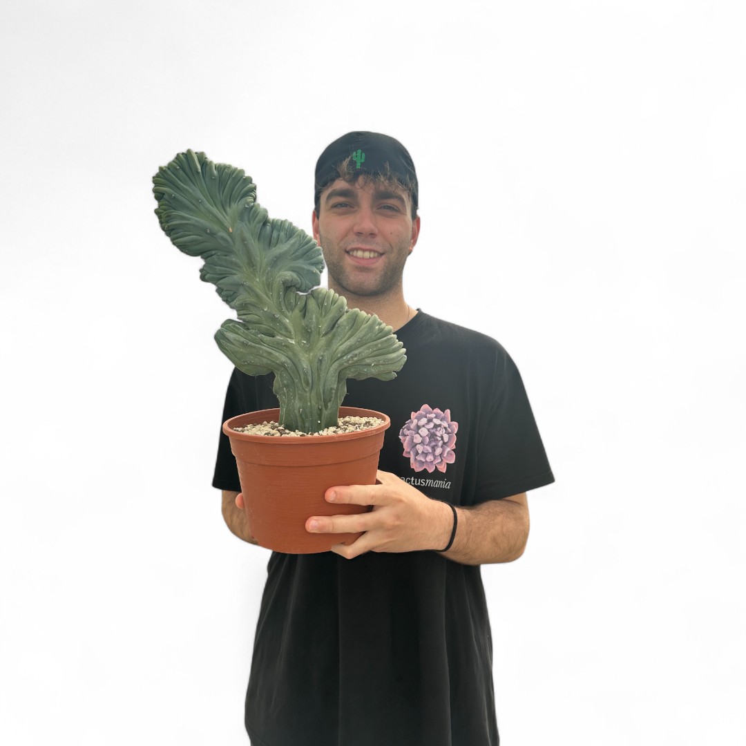 Appartenant à la famille des Cactaceae, cette plante rare de Myrtillocactus geometrizans crestato est fournie dans un pot Ø 20 cm avec une étiquette portant le nom botanique.