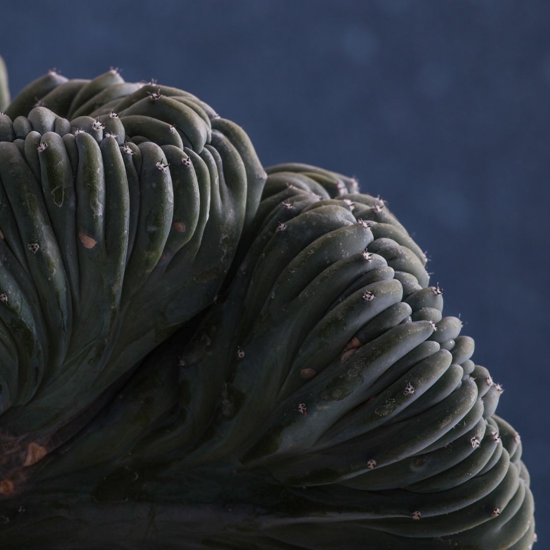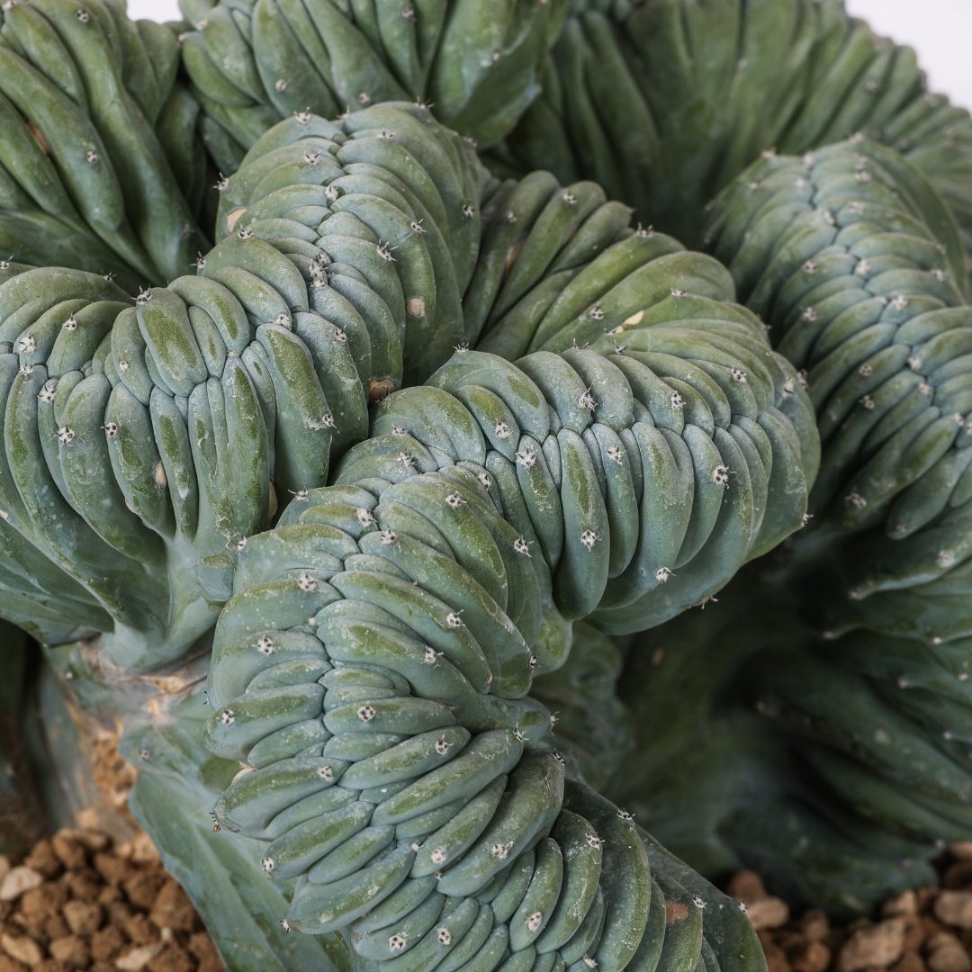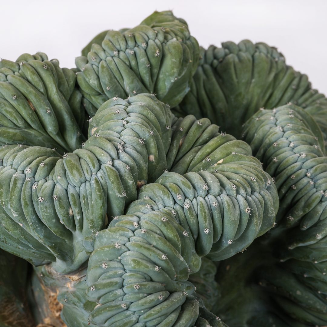 Myrtillocactus geometrizans crestato, avec ses côtes marquées, est un cactus fascinant avec une croissance anormale qui crée une forme distinctive en éventail ondulé. Couleur vive et brillante. Plante résistante, sculpturale et ornementale. Elle demande peu d’entretien, aime la lumière et craint l’eau stagnante. Parfaite pour ceux qui recherchent l’esthétique et la forme.