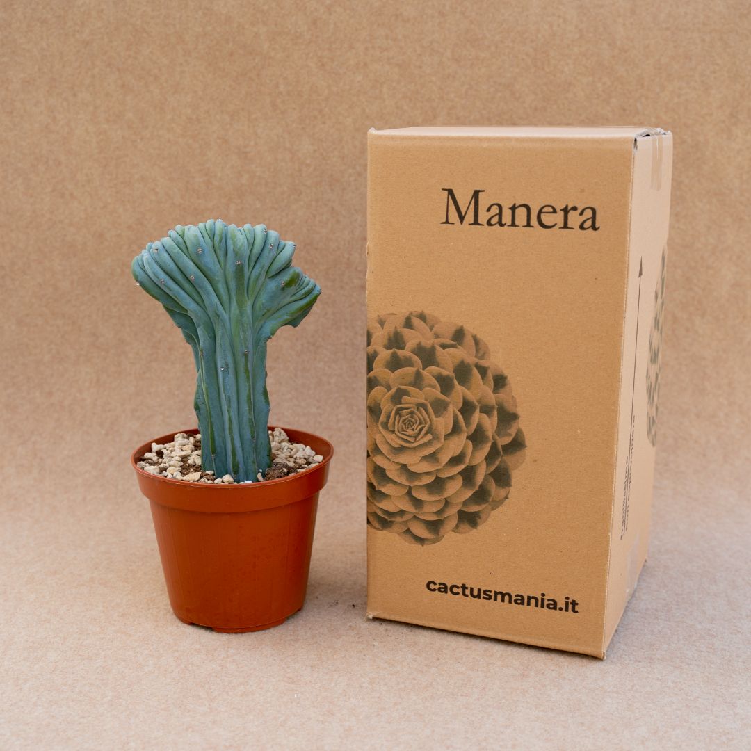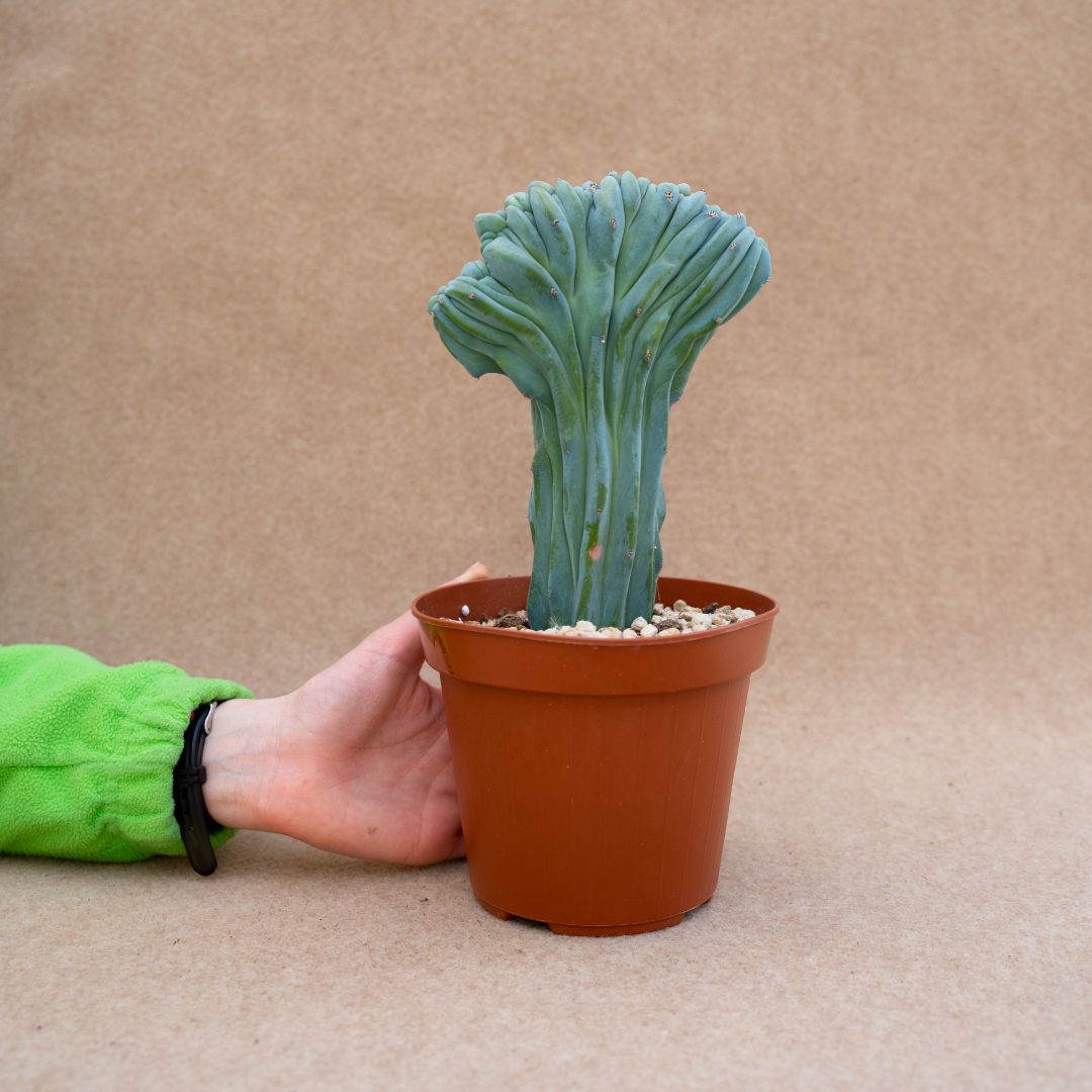 Appartenant à la famille des Cactaceae, cette plante de Myrtillocactus geometrizans f. cristata est fournie dans un pot Ø 14 avec une étiquette portant le nom botanique