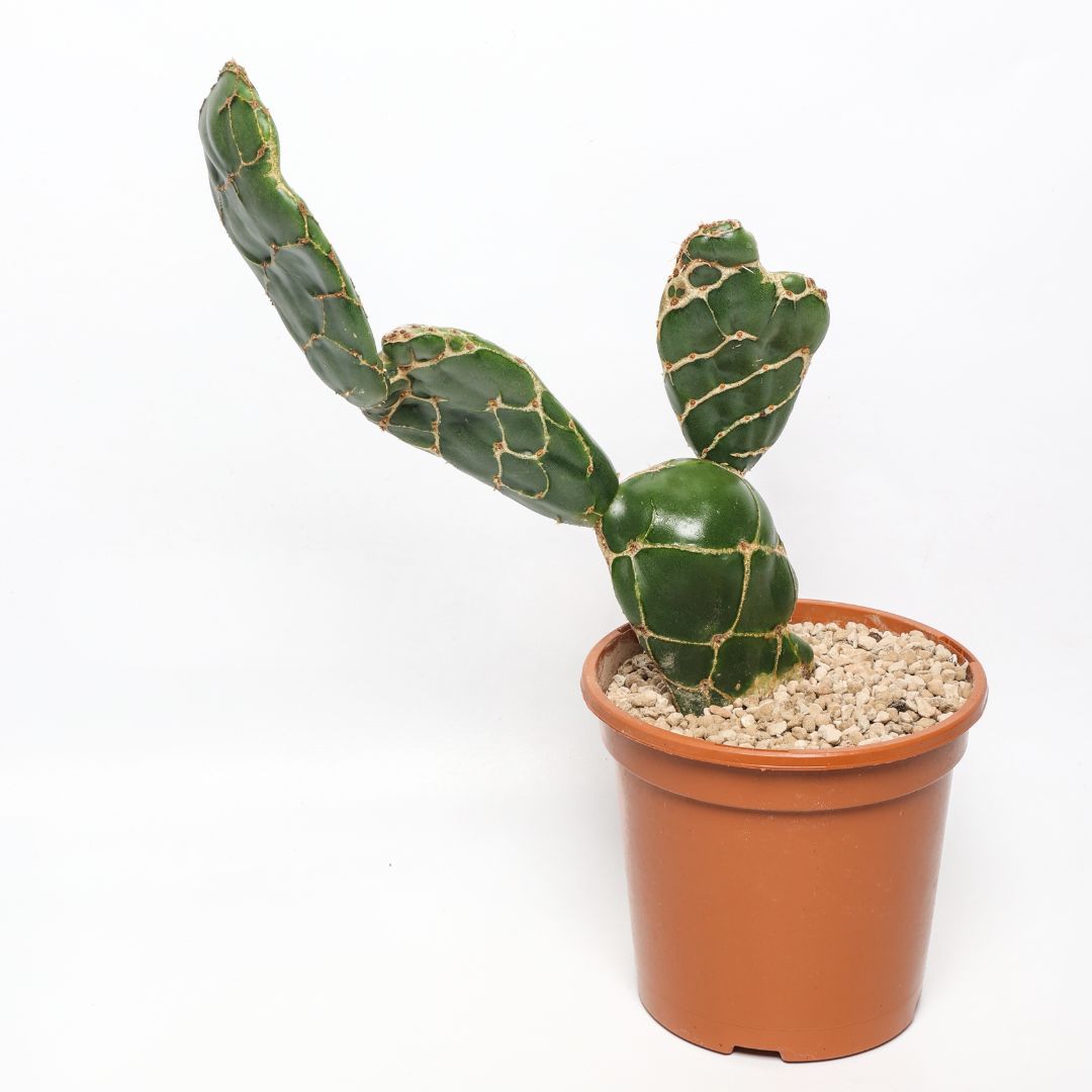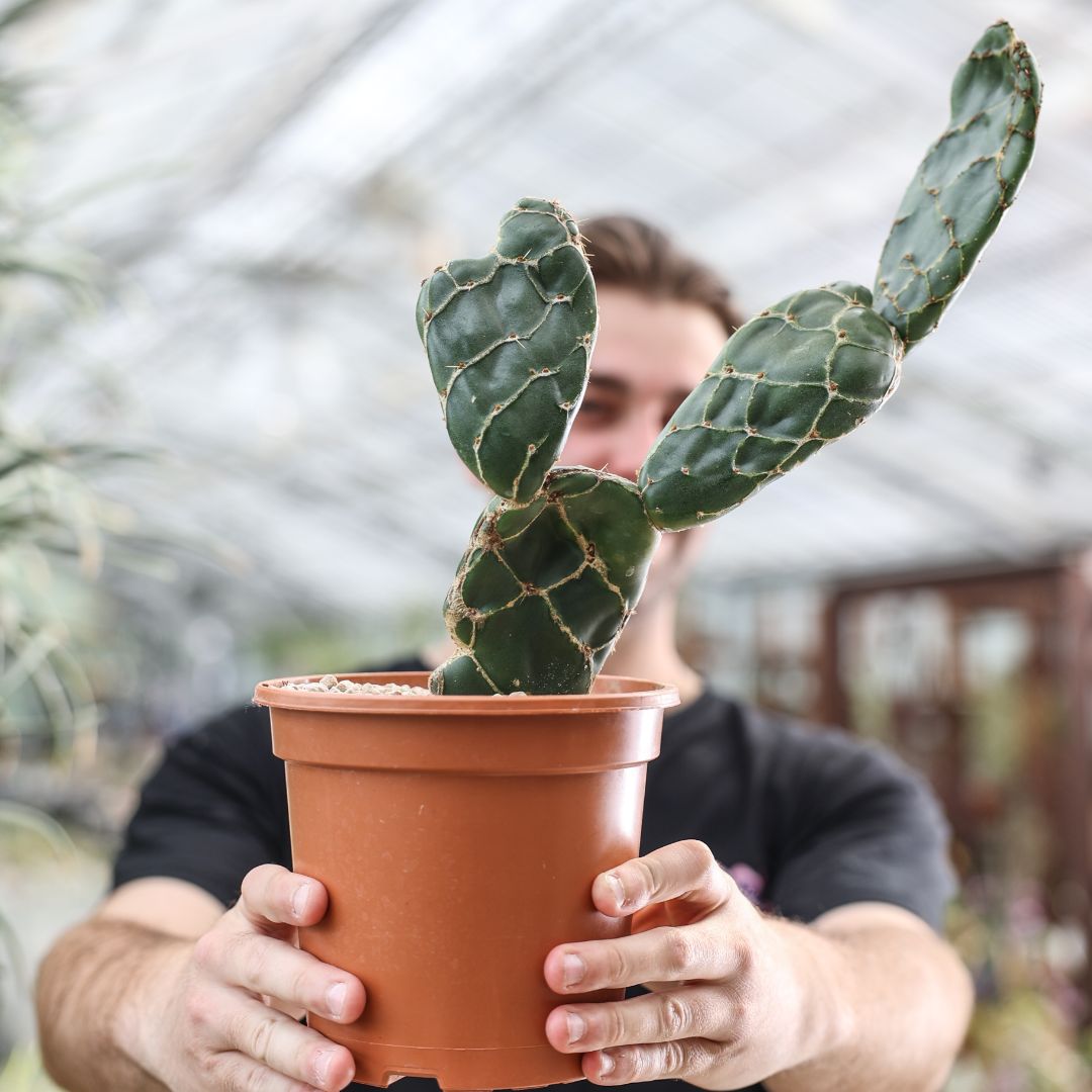 Appartenant à la famille des Cactaceae, cette plante rare de Opuntia zebrina reticulata est fournie dans un pot Ø 14 cm avec une étiquette portant le nom botanique.