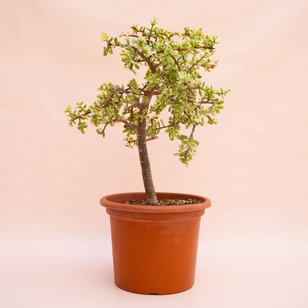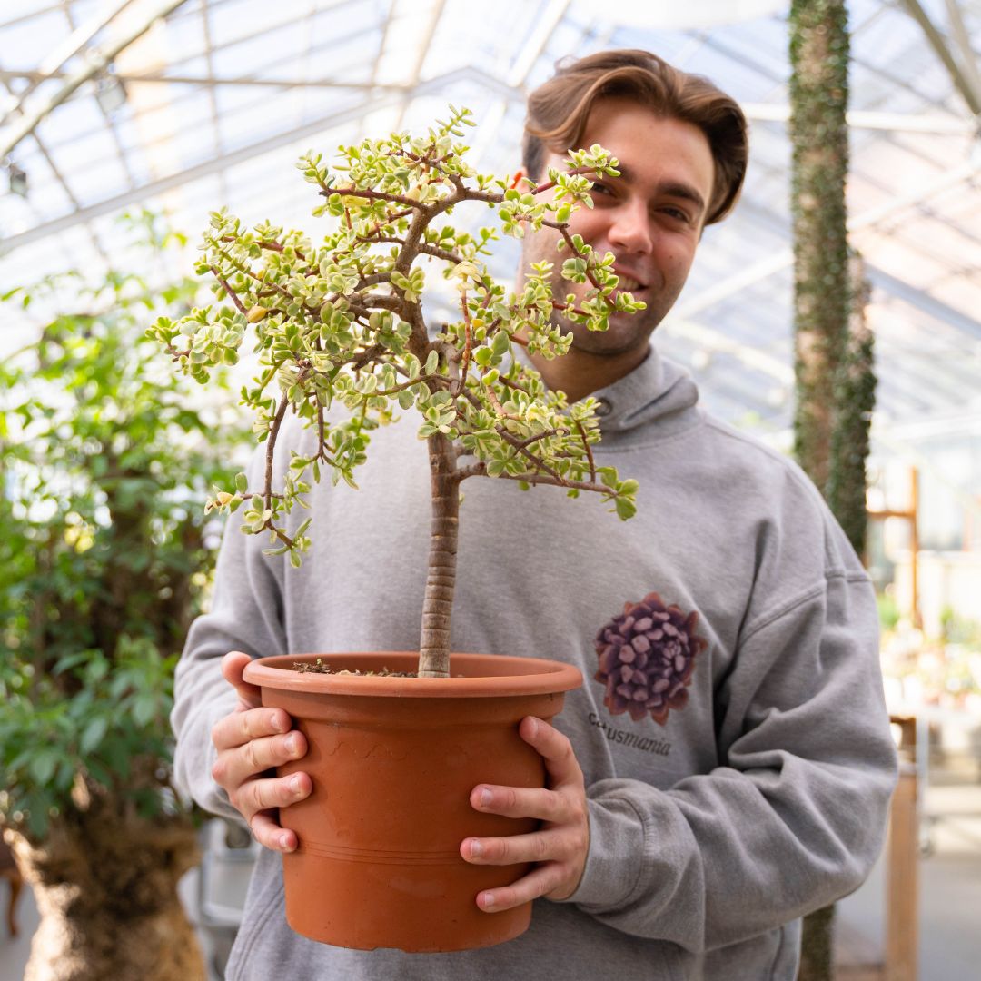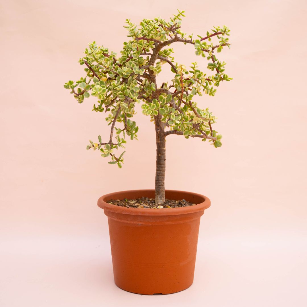 Appartenant à la famille des Crassulaceae, cette plante rare de Portulacaria afra variegata est fournie dans un pot Ø 25 cm avec une étiquette portant le nom botanique.