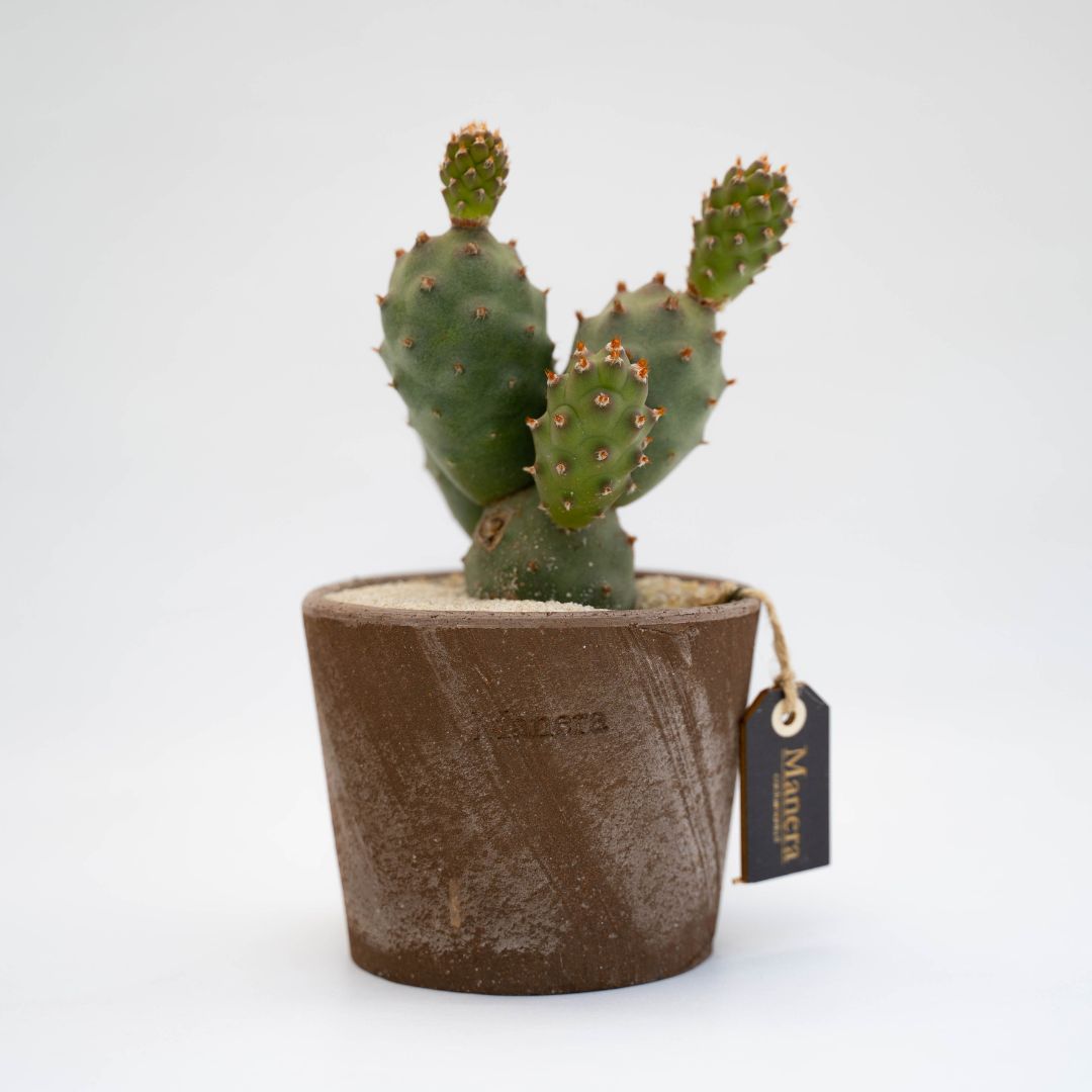 Appartenant à la famille des Cactaceae, cette plante de Tephrocactus articulatus inermis est fournie dans le pot en terre cuite Choco Ø 12 avec une étiquette portant le nom botanique.