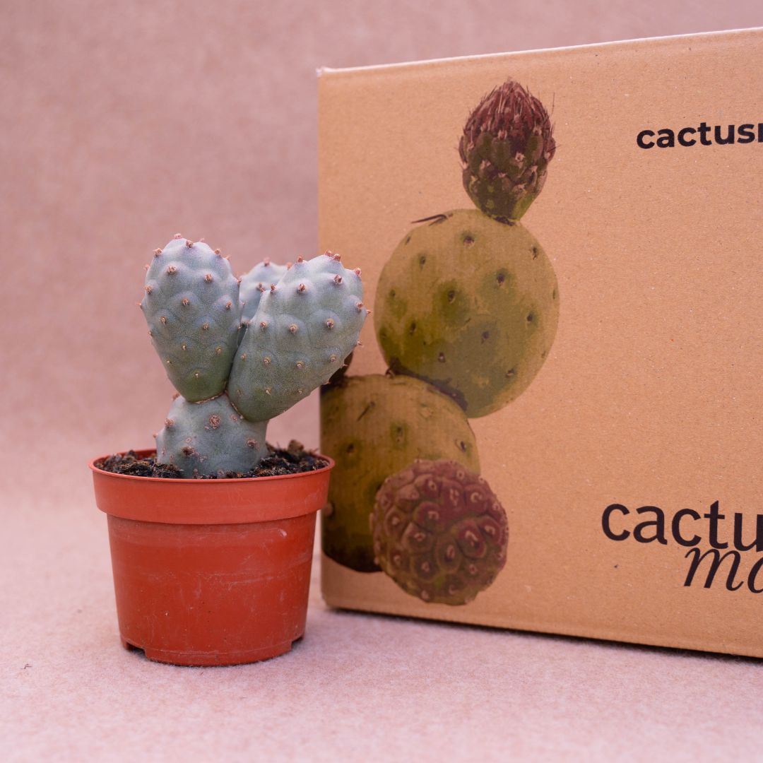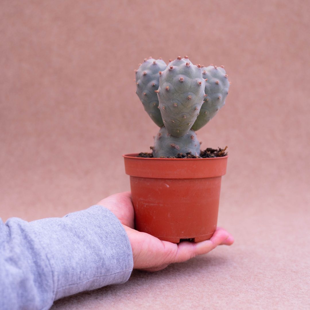 Appartenant à la famille des Cactaceae, cette plante de Tephrocactus strobiliformis est fournie dans un pot Ø 10,5 cm avec une étiquette portant le nom botanique.