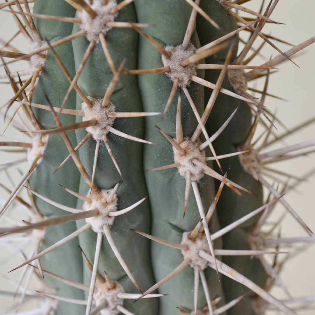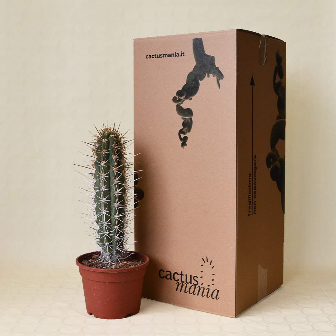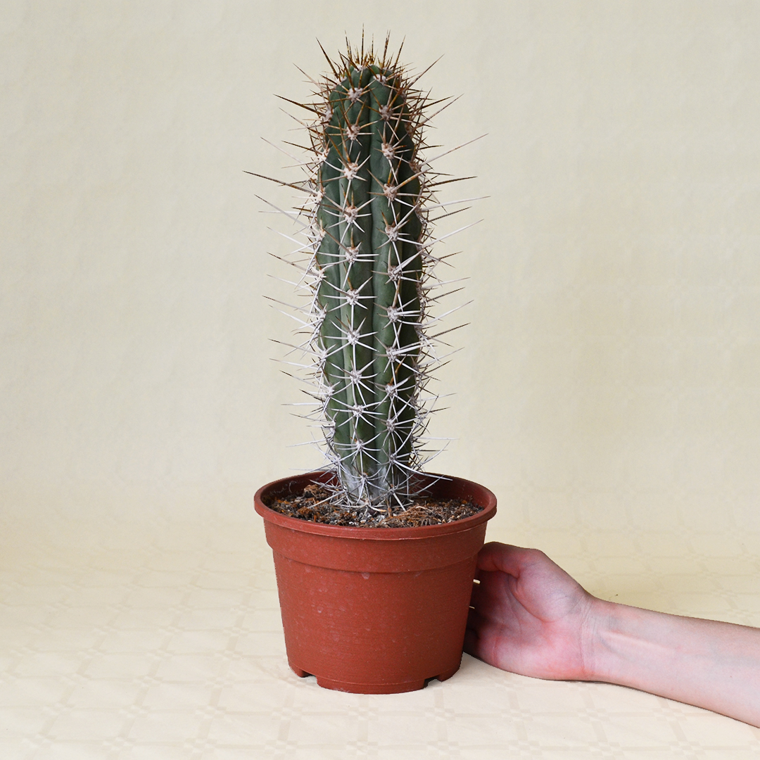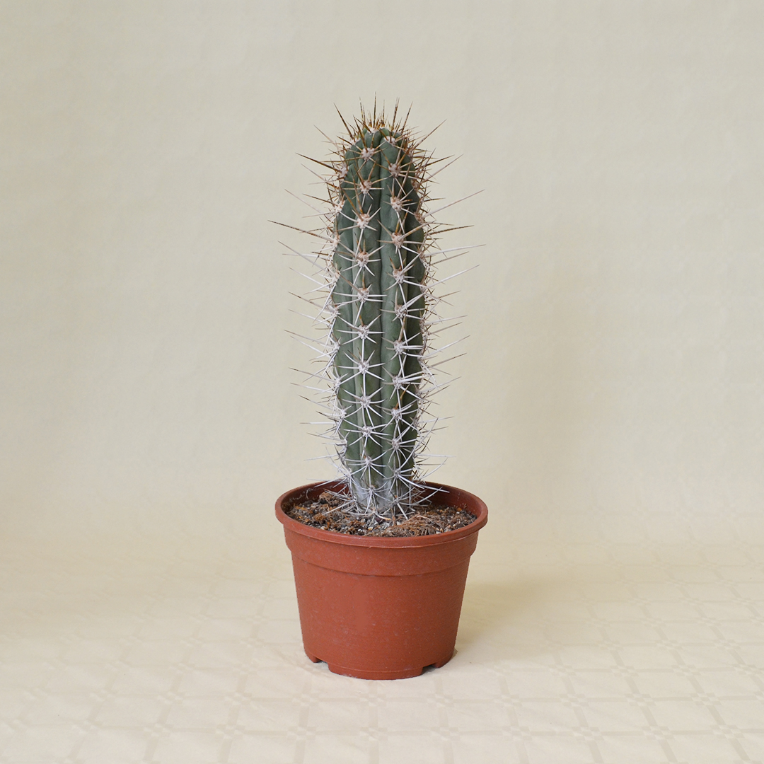 Appartenant à la famille des Cactaceae, cette plante de Trichocereus chiloensis est fournie dans un pot Ø 16 avec une étiquette portant le nom botanique.