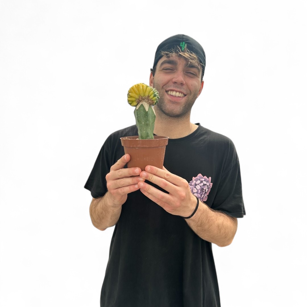Appartenant à la famille des Cactaceae, cette plante de Trichocereus pachanoi crestato variegato est fournie dans un pot Ø 12 cm avec une étiquette portant le nom botanique.